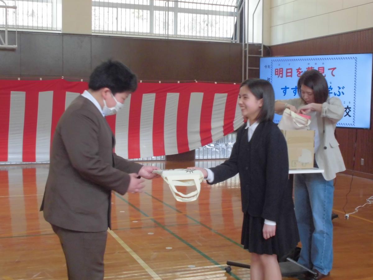 中学校3年生5名が中心となって、校内等の皆さんに呼びかけ、「是非ほしいです!」と声をあげた本校に届くことになりました。神田女学園ソフトボール全国大会優勝記念の水筒や校章入りのエコバッグ、シャープペンシルや替え芯、鉛筆等本当にたくさんの物をいただきました。