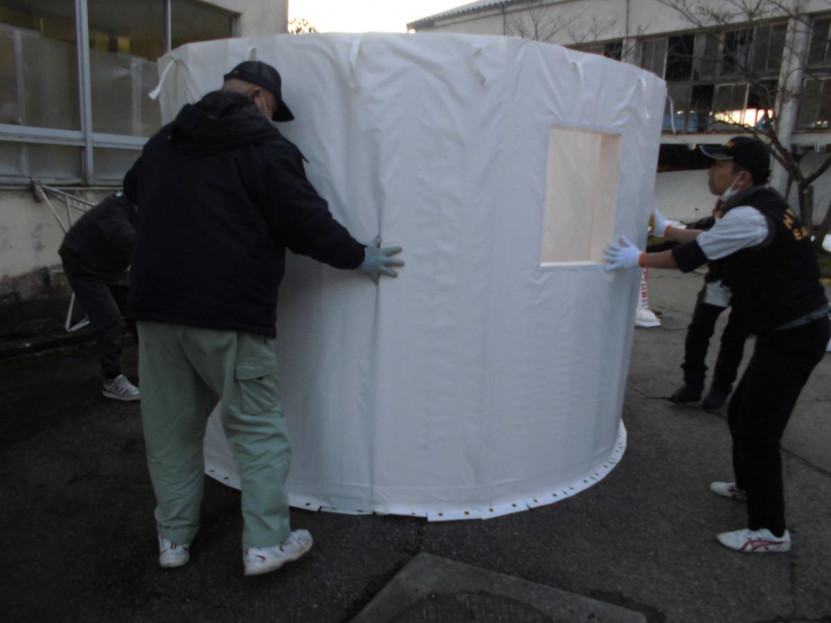 16日(火)、学校を再開して2日目です。今日は朝から冷える1日でした。学校周辺は真っ白、時折吹く風で芯から冷えそうな日となりました。そんな中、運動場では仮設住宅の建設も本格的に始まっているようでした。