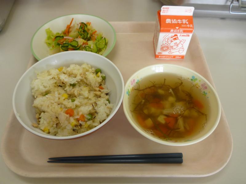 本日の献立は、ジャンバラヤ・グリーンサラダ・野菜のコンソメスープ・牛乳でした。ジャンバラヤは給食でも何度か登場したことのあるメニューです。アメリカ南部のルイジアナ州に移住した、「ケイジャン」と呼ばれるフランス系移民の人たちの庶民的な料理です。米と野菜と肉をメインにしたもので、スペインの「パエリア」をもとに作られたと言われています。今日もおいしくいただきました!