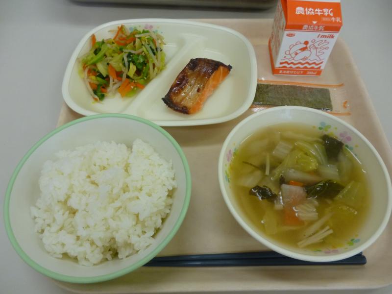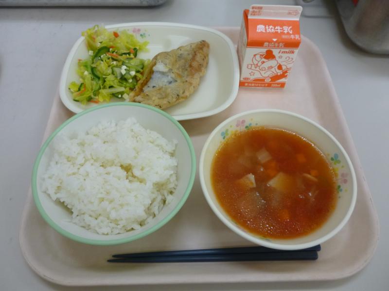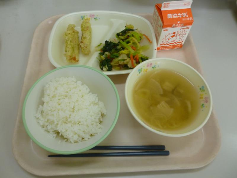 本日の献立は、ごはん・ちくわの石垣揚げ・やたら漬け・豚汁です。今日は午後からかなりの冷え込みとなるそうですが、あったかい豚汁が体にしみわたりますね。温かいものを食べると、胃腸の働きが活発になり、消化を助けるほか、身体があたたまることで血流がよくなり、免疫力の向上や疲労回復が期待できるそうです。寒い季節におうちであたたかい鍋を囲むのも、理にかなっていますね。今日もおいしくいただきました!