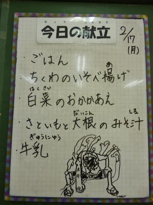 本日の献立は、図書給食でごはん・ぎょうざ・キャベツの中華サラダ・小松菜とコーンの中華スープ・牛乳でした。絵本「ぎょうざがういなくなりさがしています」に登場するぎょうざです。タイトルの通り「きょうざがいなくなりさがしています」という町の放送から始まります。いったいどんなお話が展開していくのでしょうか、ぎょうざはどこで何をしているのか、気になるところですね。今日もおいしくいただきました!