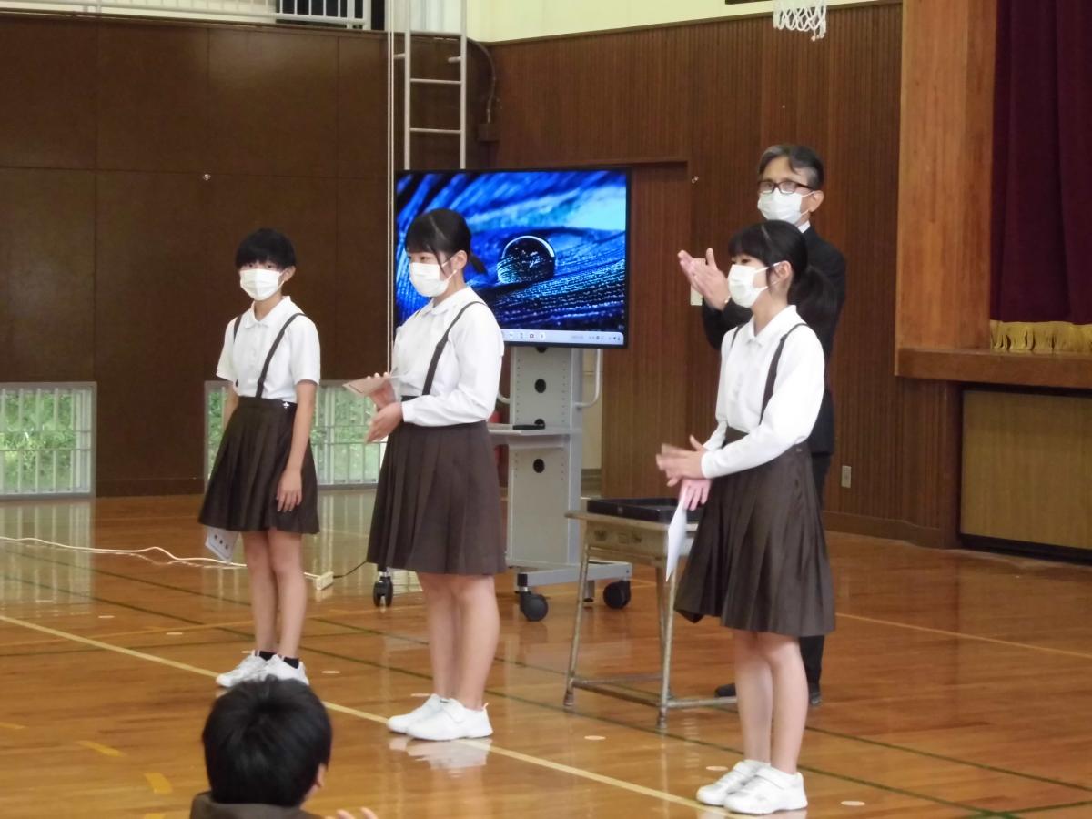 また生徒指導からは「救急車・パトカー・不審者」に気をつけること,メディア使用「わが家のきまり」を守ることなどをお話しました。最後に養護教諭から,夏休みを利用して,歯や目の治療をしてほしいことをお話しました。