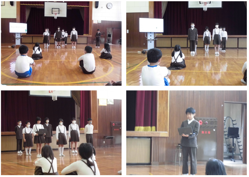 次に、後期委員会任命式及び活動紹介を行いました。3つの各委員会の後期委員長が任命されました。任命された6年生3年生の表情には頼もしさを感じました。続けて、各委員会から10月の活動目標や活動内容が紹介されました。それぞれに児童会の活動がよりよくなるように工夫された内容でした。後期の委員会活動にも期待したいと思います。