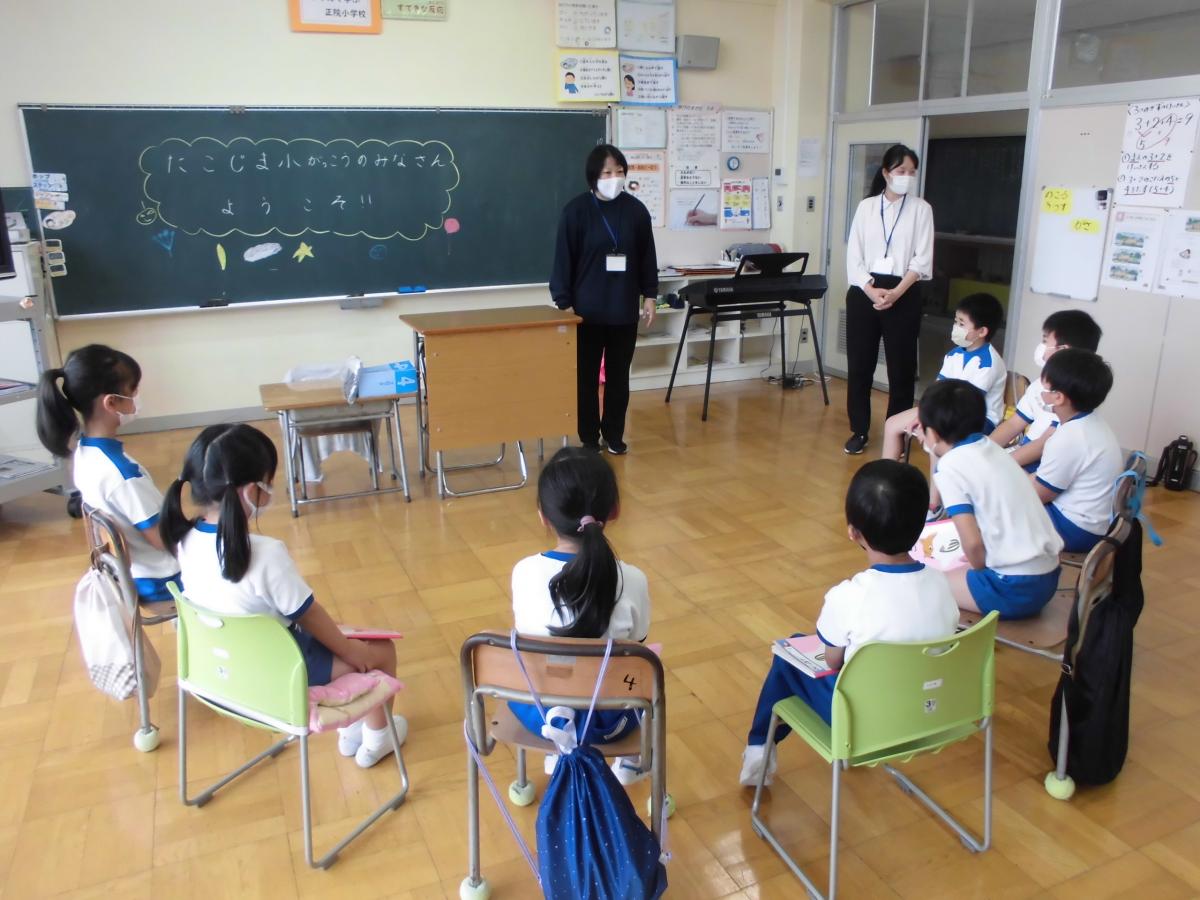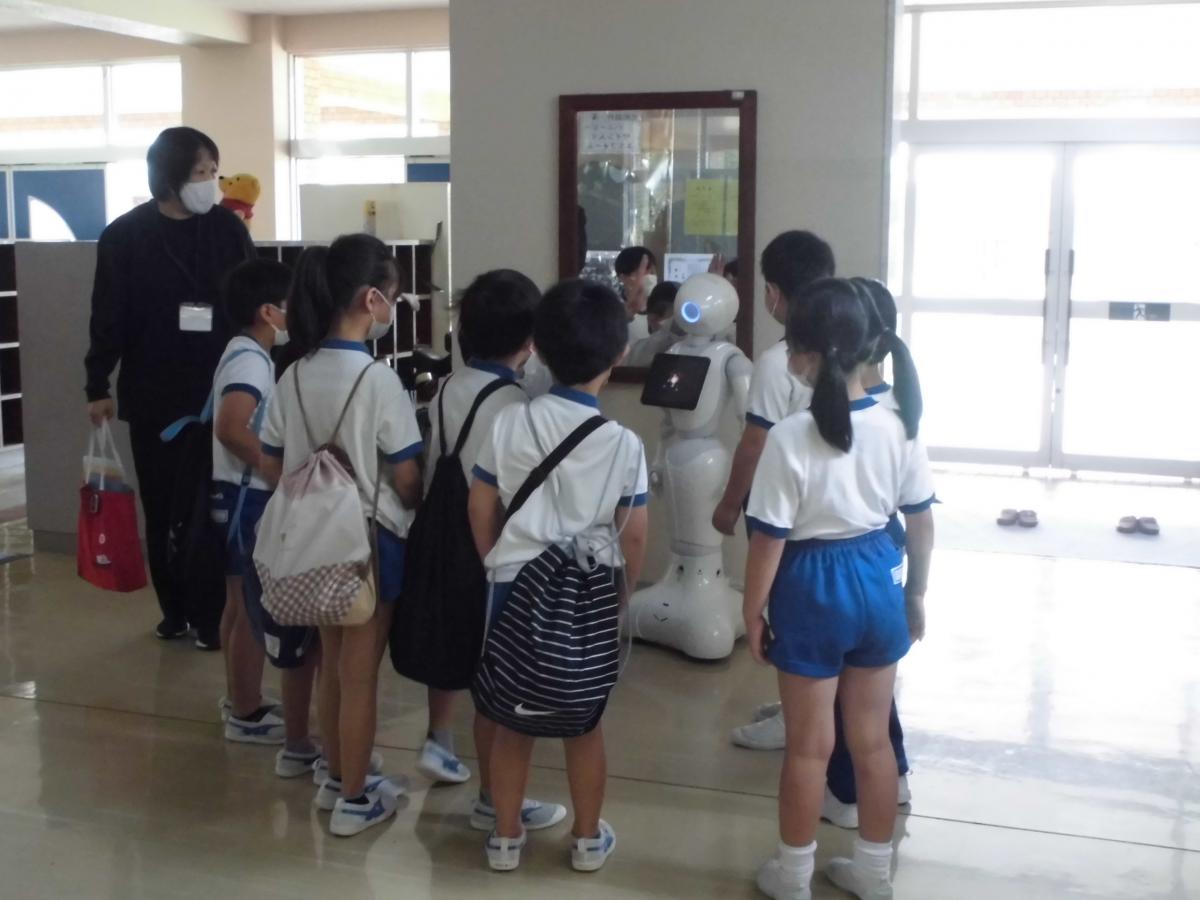 10日(火)の2~3限目は、蛸島小の1年生5名を本校に招いて交流学習を行いました。蛸島小の子どもたちは、まず玄関に置かれたペッパー君に興味津々。ペッパー君の朝のあいさつにに合わせて元気に挨拶してくれました。