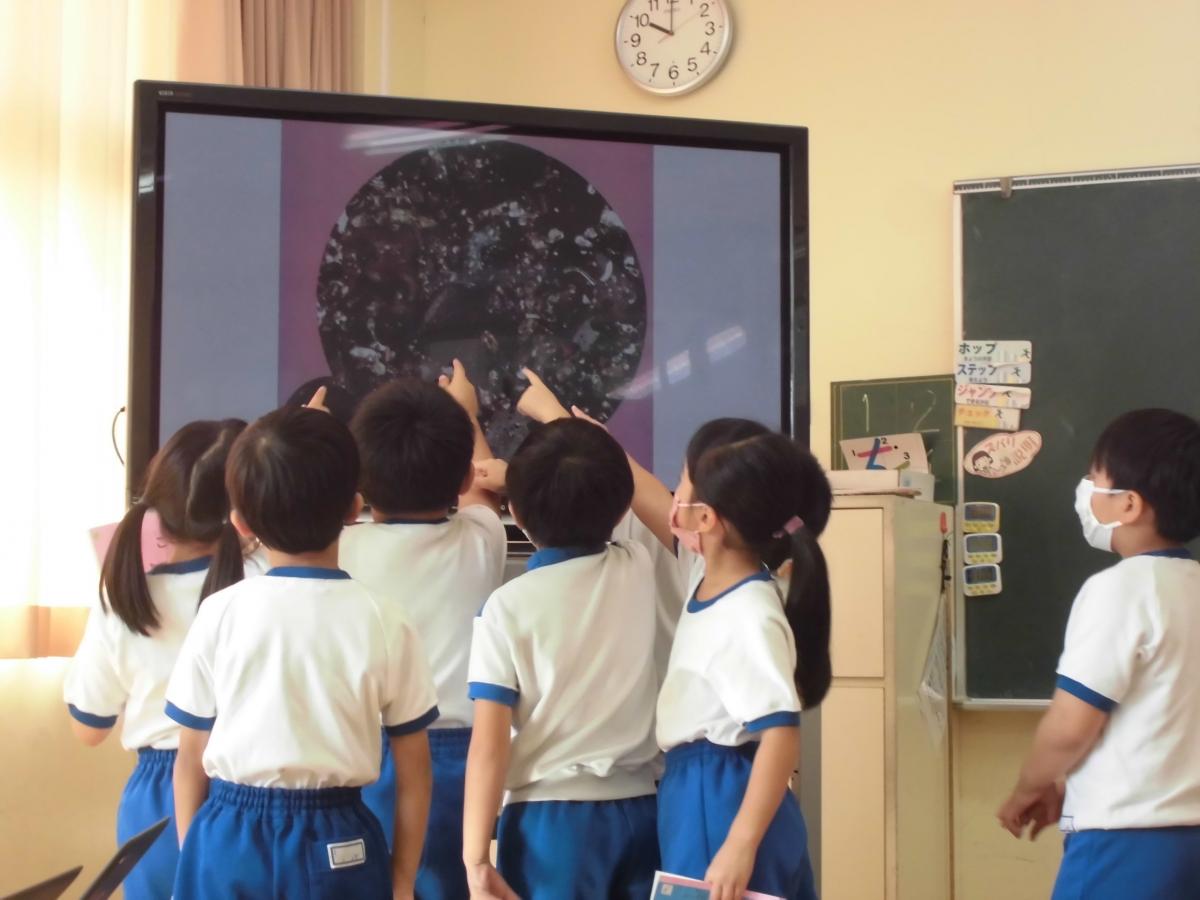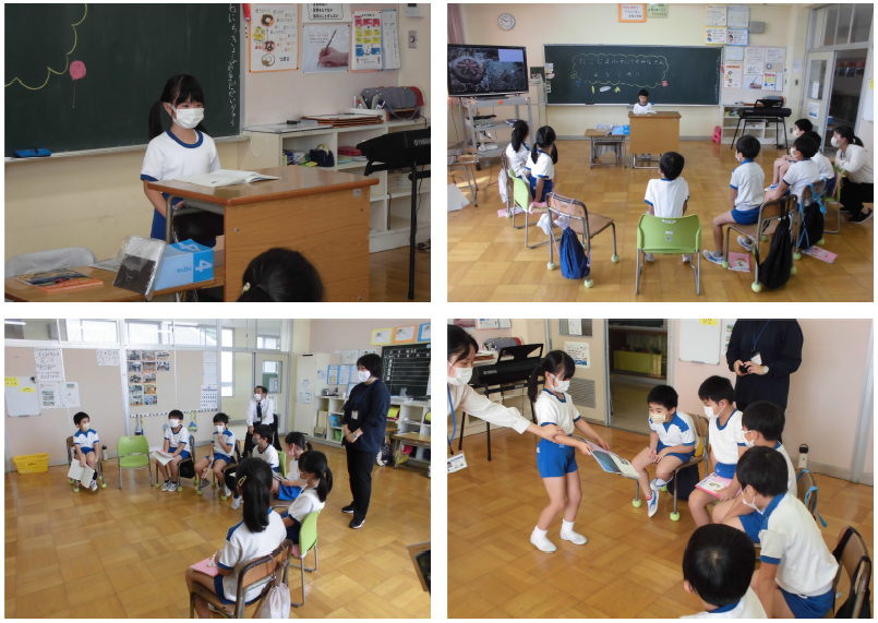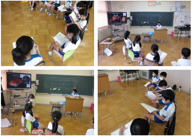 2限目は1年教室で国語科の学習です。「うみのかくれんぼ」という単元で、自分たちが調べた、海でかくれんぼしている生き物を紹介し合いました。みんなそれぞれ調べたことをはっきり発表したり、質問や感想を話したりしました。たくさんの質問や感想があり楽しく時間は過ぎていきました。