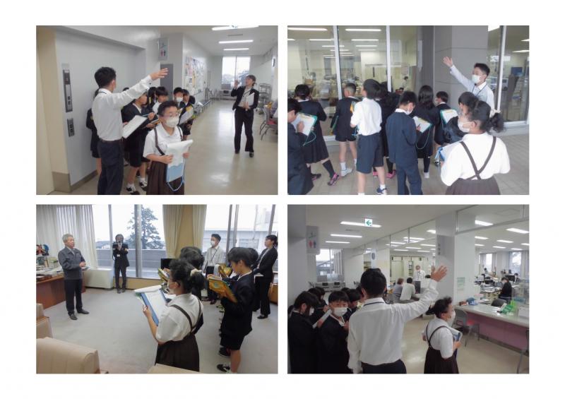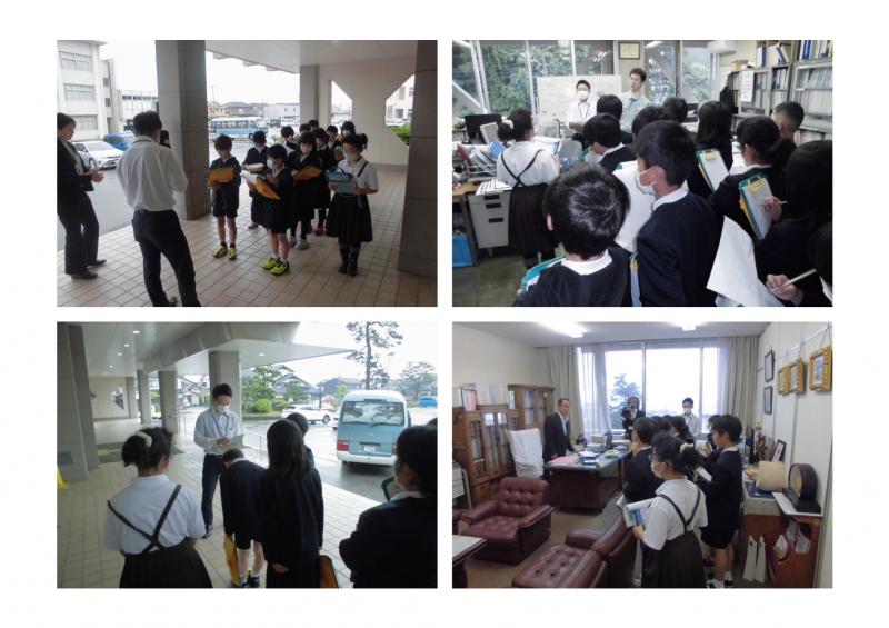 最初に珠洲市役所を訪問しました。市教委の森田さんの案内で、4階から順に各階にどんな課があり、どんな仕事をしているのかを教えていただきました。4階では市教育長と、3階では市長とお会いでき、いろいろな質問をさせていただきました。それぞれの場面で、直小の児童は多くの質問をし、メモしていました。坂東さんも計3回質問することができました。
