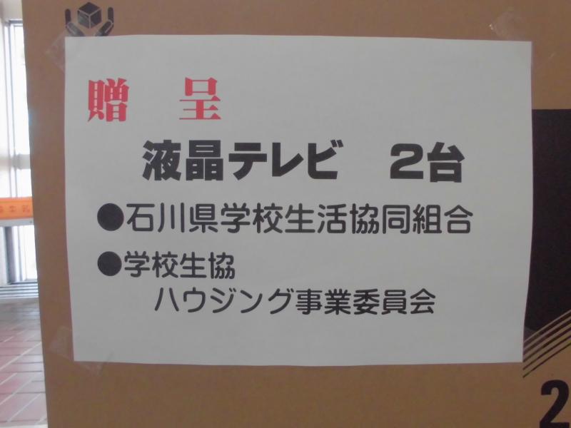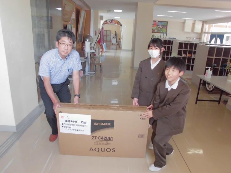 24日,今回の地震で子どもたちが授業で使用していたテレビモニターが故障したため,石川県学校生活協同組合様からテレビモニター2台を寄贈していただきました。児童を代表し,6年生の西さん・角居さんから『ありがとうございます。みんなで大切に使います。』とお礼の言葉を伝えました。
