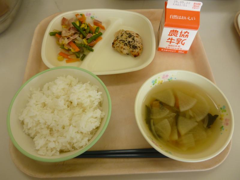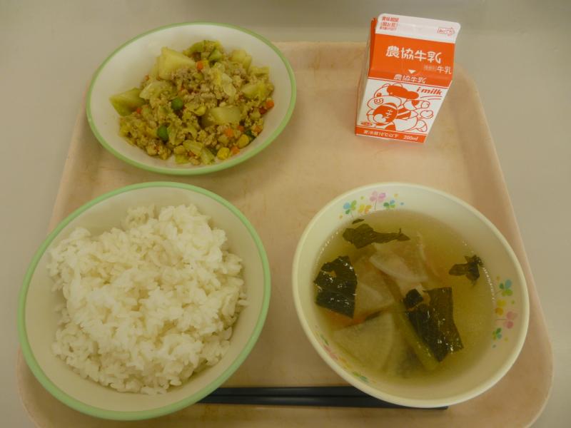 本日の給食は、ごはん・じゃがいものインド風煮・大根とベーコンのスープ・牛乳でした。インド風煮は、予想どおりカレー味でした!材料にひき肉だけではなく、大豆ミートも使われています。大豆ミートはお肉に負けないほどの良質なたんぱく質をとることができ、摂取量が不足がちな植物性たんぱく質もとることができるので、体に良いとされています。給食でのメニューは、おいしく食べられて、さらに体によい工夫も色々されているのですね。今日もおいしくいただきました!