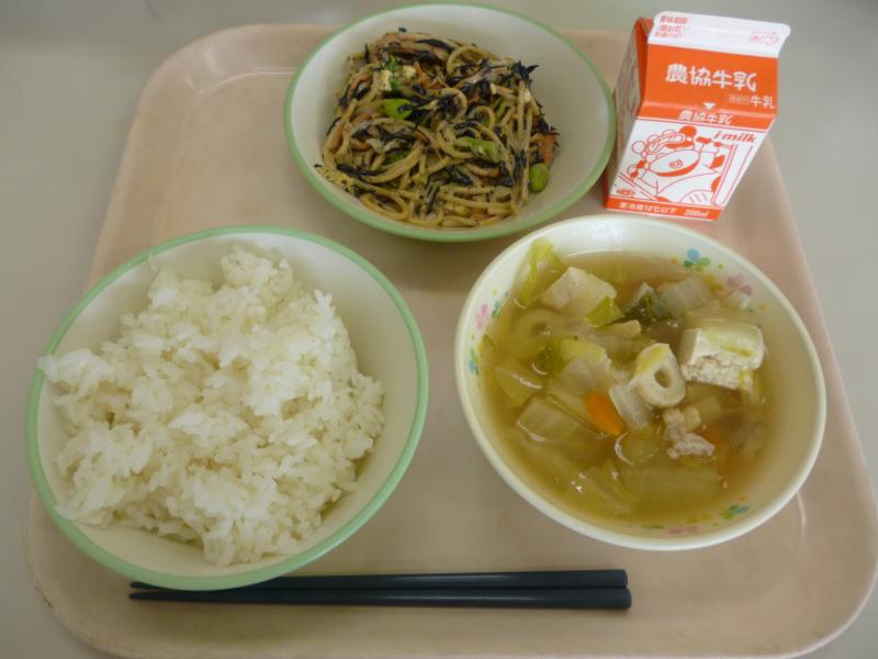 本日の給食は、ごはん・ひじきのマヨスパサラダ・よせ鍋汁・牛乳でした。ひじきには歯や骨をじょうぶにするカルシウムや、お腹のそうじをしてくれる食物繊維など私たちの健康や体の成長に必要な栄養がたくさん入っています。ひじきのマヨスパサラダは和風のさっぱりしたたべやすい味付けで、お家でも食べたいという声も。今日もおいしくいただきました!