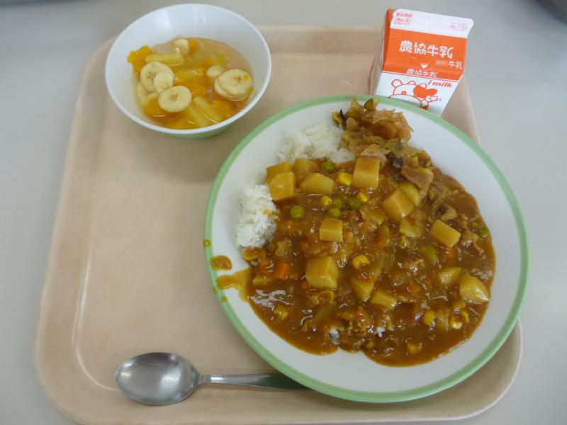 本日の給食は、ポークカレー・フルーツポンチ・福神漬・牛乳でした。このメニューは不動の一番人気の給食です!フルーツポンチにはナタデココが入っています。ナタデココはフィリピンの伝統的な食品で、ココナッツジュースをナタ菌で発酵させて作られます。食物繊維が豊富で、コリコリとした独特の歯ごたえがクセになりますね。今日もおいしくいただきました!