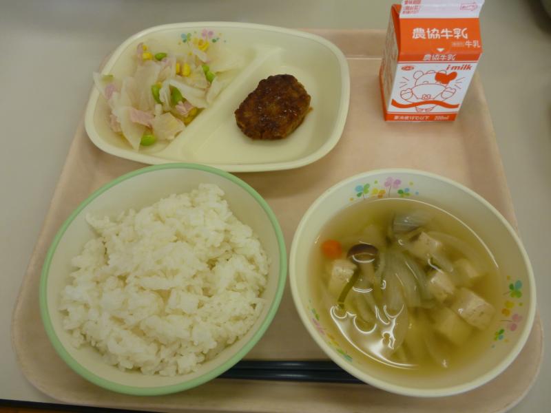本日の給食は、ごはん・ハンバーグ・大根とハムのサラダ・しめじのコンソメスープ・牛乳でした。今日は全員が余裕で時間内に食べ終えることができました!!みんな大好きハンバーグ効果でしょうか。おかわりも5人が手をあげる人気ぶりです。今日もおいしくいただきました!