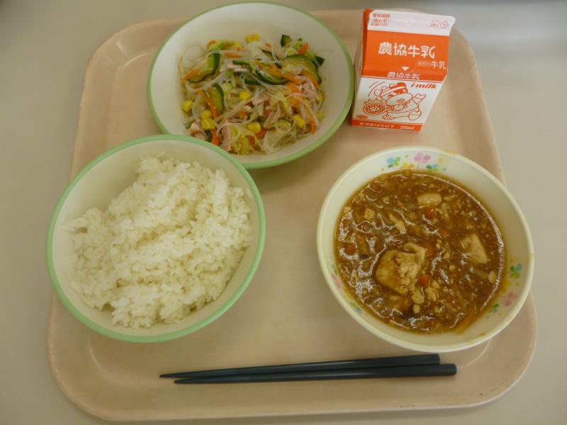 本日の給食は、ごはん・麻婆どうふ・春雨サラダ・牛乳でした。今日調理した麻婆どうふには、なんと!18㎏ものお豆腐が使われています(珠洲市の6校分の給食を飯田小学校の共同調理場で作っています)。だいたい小学校1年生ひとりの体重くらいの重さですね。毎日こんなにたくさんの量の食材を扱い、美味しく調理してくださっている調理員さんたちには感謝しかないですね。今日もおいしくいただきました!