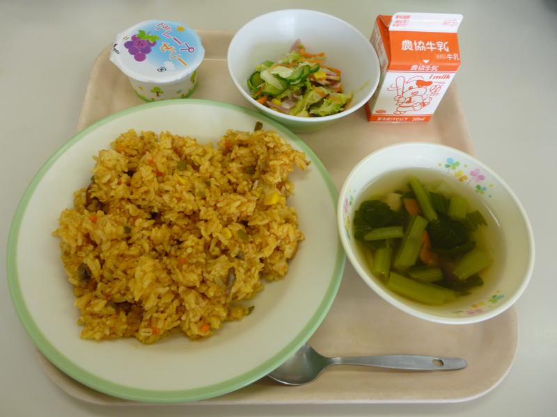 本日の給食は、ジャンバラヤ・イタリアンサラダ・小松菜のスープ・グレープゼリー・牛乳でした。ジャンバラヤは、アメリカ南部の料理で、スペインの『パエリア』に起源があると言われています。ひき肉・ソーセージが入っていて、ケチャップやカレー粉などで味付けをしてます。またアメリカ南部では、ケイジャンやジャンボなどスパイスをふんだんに使った料理がよく食べられるそうです。今日もおいしくいただきました!