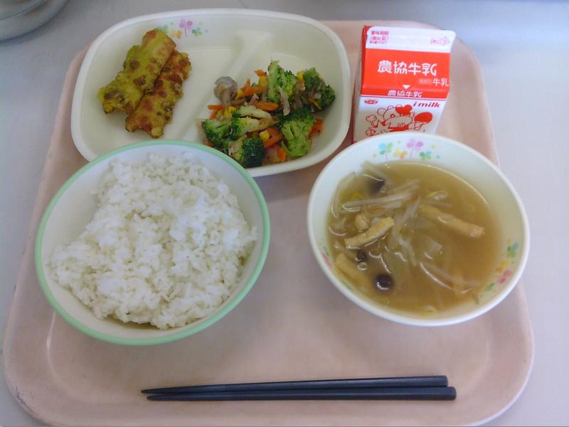 本日の給食は、ごはん・ちくわのお茶天ぷら・ブロッコリーのおかか和え・もやしのみそ汁・牛乳でした。今日5月1日は、立春から数えて88日目にあたり、八十八夜になります。この時期は朝の冷え込みがなくなることから(いや、今日は結構冷え込んでるゾ!?室内でも手がかじかんで指先の感覚がなくなるくらい寒い)、農作物の豆まきや新茶の茶摘みの時期とされているそうです。このため、今日は八十八夜にちなんで、『八十八夜給食』として、ちくわの衣に抹茶が入っていました。そんなわけで、今日もおいしくいただきました!