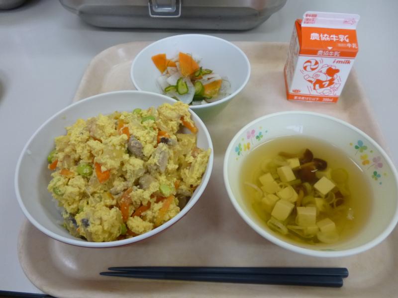 本日の給食は、親子丼・やたら漬け・なめこのすまし汁・牛乳でした。親子丼はにわとりの肉と卵を使うことから『親子丼』と名付けられています。これは東京のにわとり料理のお店が、とり鍋を卵でとじて食べていたことから美味しいと広まったそうです。今日もおいしくいただきました!