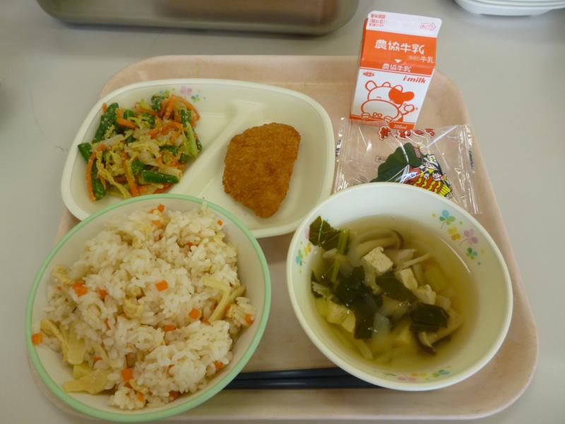 ゴールデンウイークあけの本日は、遅ればせながら子どもの日給食でした。メニューは、たけのこごはん・カツオかつ・いんげんのゴマ和え・きのこのすまし汁・かしわもち・牛乳。たけのこは成長が早くまっすぐ伸びるので健やかな成長を、カツオは元気で力強い子に育ってほしいという願いが込められていて、子どもの日に食べられる食材のひとつです。今日もおいしくいただきました!