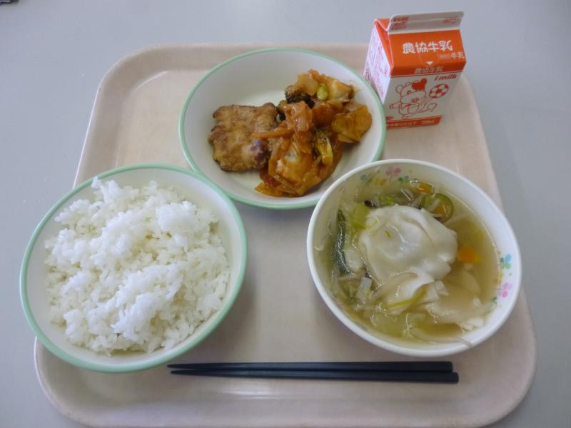 本日の給食は、ごはん・とりチリソース・海鮮ワンタンスープ・牛乳でした。とりチリソースと聞いて、みなさんがよく知ってる『エビチリ』のうようなものをイメージして準備してたら、入れ物をはじめお皿の形やお玉の数が合わない!なにゆえ???…と思いきや、とり肉を揚げたものに野菜のピリ辛ソースをかけるスタイルだったので、(本気でホワイトボートに書いた献立もしくは日付をまちがえたかと思い)献立表を5度見してしまいました。いつもよりボリューム多めのメニューでしたが、午前中の田植え作業のおかげで「いつもより多めにして!」「もっと盛っても食べれます!」との声もチラホラ。何はともあれ、今日もおいしくいただきました!