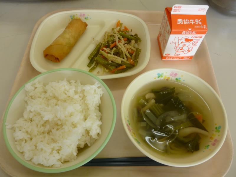 本日の給食はごはん・春巻き・茎わかめの中華炒め・チンゲン菜の中華スープ・牛乳でした。中華炒めに入っている茎わかめは、わかめの『くき』の部分のことで、わかめの葉っぱの部分よりも固めのコリコリとした食感が特徴的です。食物繊維が豊富で、お腹の調子を整えてくれる食材のひとつです。今日もおいしくいただきました!