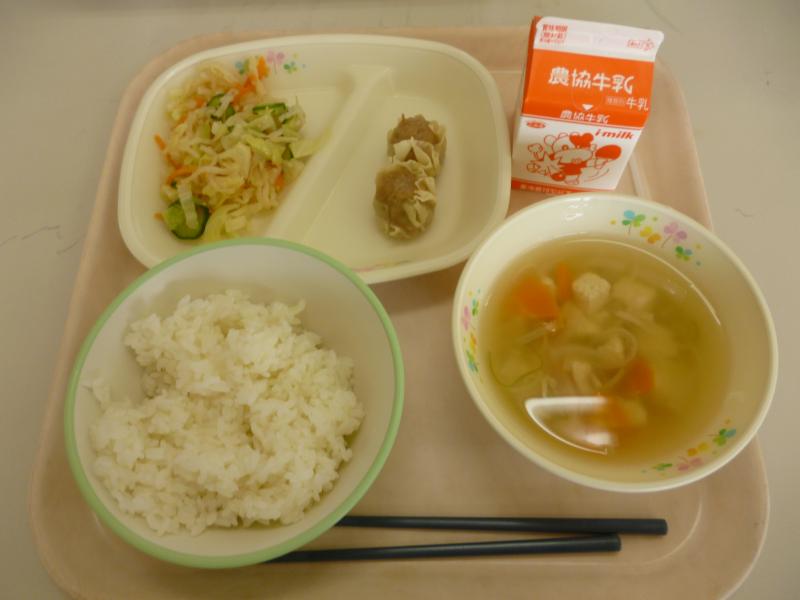 本日の給食は、ごはん・しゅうまい・切干大根の中華サラダ・とうふの中華スープ・牛乳でした。2限目ににスポーツサイクル教室があり、適度に外で体を動かしたせいか、給食前から「おなかすいた~」という声も。このため今日は時間内に食べ終わった子がほとんど。今日もおいしくいただきました!
