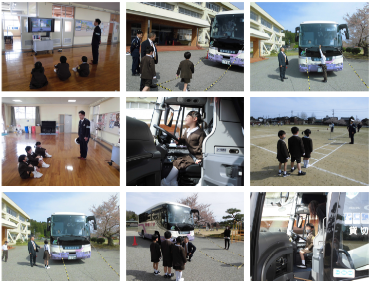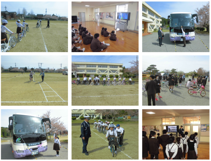 4月11日の午後,交通安全教室を行いました。好天の中,珠洲警察署さんをはじめ,交通安全協会,交通推進隊,めだか交通さんにもご協力いただいて実施しました。1年生は,道路での安全な歩行や横断の仕方について,3年生以上は安全な自転車の乗り方について学びました。運動場に書かれた交差点を使って,正しい歩き方や乗り方について集中して学ぶ姿が見られました。また,自転車点検についても参加者は全員合格,ヘルメットも全員自分のものを使って行うことができました。保護者の皆様には,学校まで自転車を運んでいただきありがとうございました。気付いたことは明日,お便りで配布します。ご確認下さい。