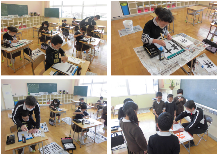 13日,3年生は書写の時間に,初めての毛筆に取り組みました。準備の仕方,筆の持ち方,筆の使い方など,すべてが初めてでしたが,みんな集中して【止める,動く,止める】を繰り返して,漢字の「一(いち)」を書く練習をしていました。そんな中で,4年生は集中して,「林」を書く練習をしていました。これからのみんなの上達が楽しみですね。