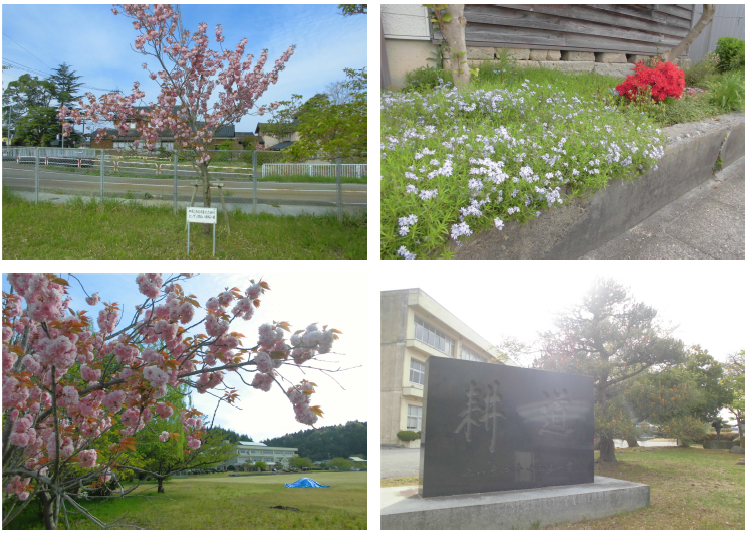 24日,朝の子どもたちの登校を迎えていると,学校周辺でいろいろな発見があります。今日は学校前横断歩道近くに咲く花や創立百周年の校歌碑,そして校庭に咲く寒山八重桜です。特にこの八重桜は,平成21年度卒業生が植えてくれたものです。きれいなものに囲まれて,正院の子どもたちは幸せだなぁと感じる時間でした。