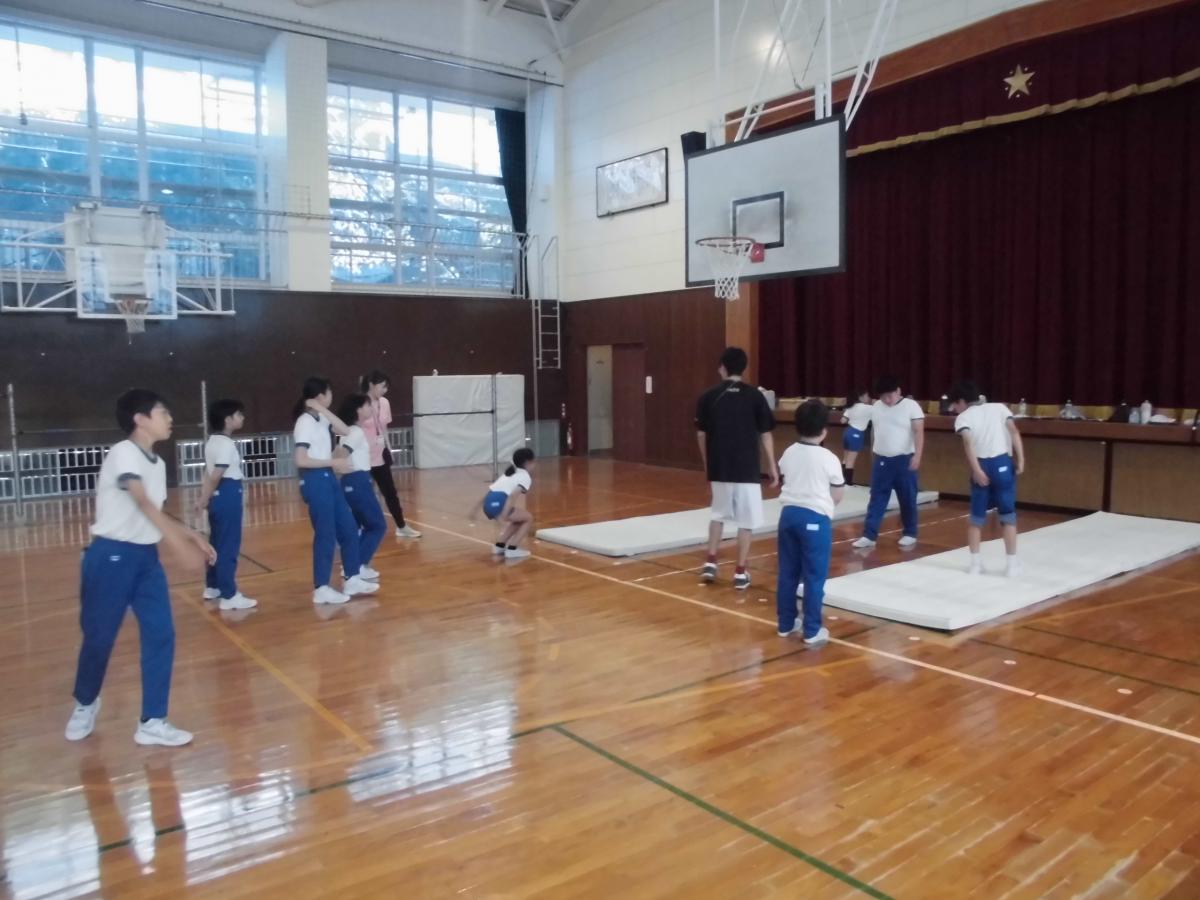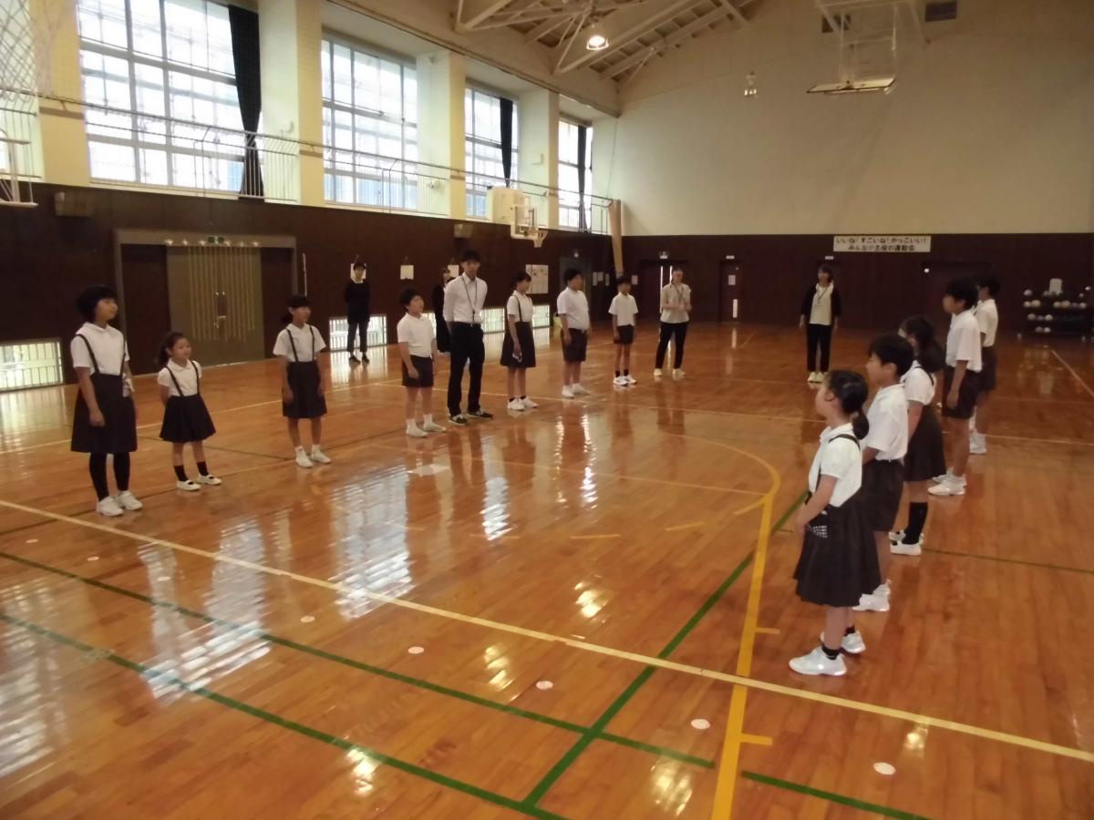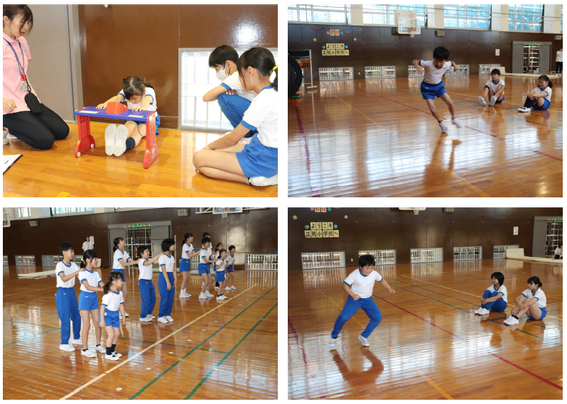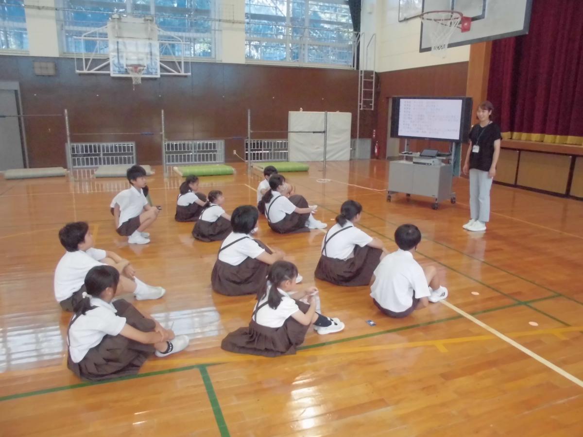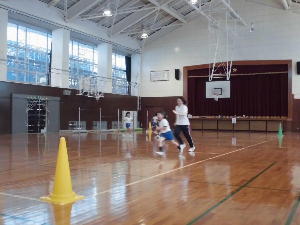 5限目、体育館から子どもたちの歓声が聞こえてきました。1・2年生が体育館で体育の授業です。ウォーミングアップで、先生が鬼になり鬼ごっこをしていました。お昼の段階で、熱中症指数は「注意」。水分を取りながら汗を流して運動を楽しむ姿が見られました。
