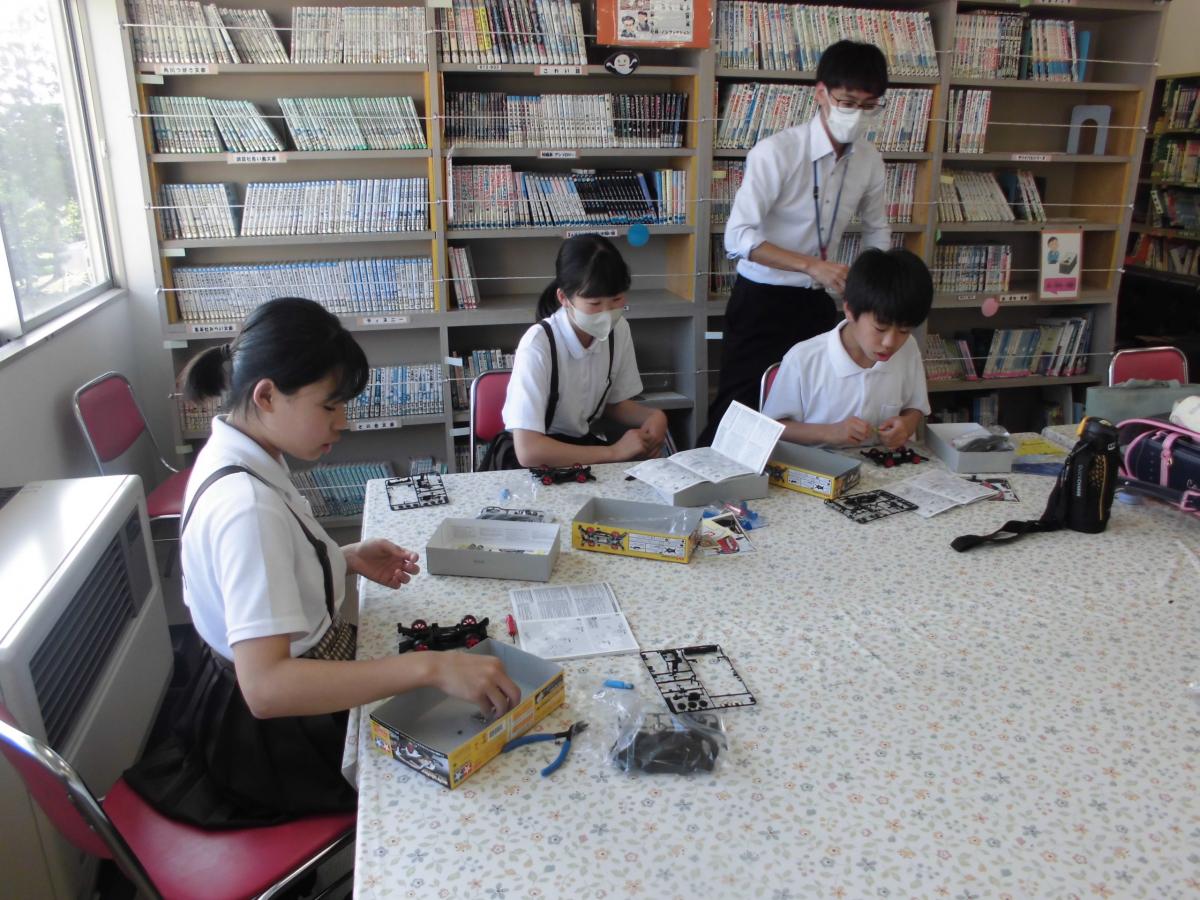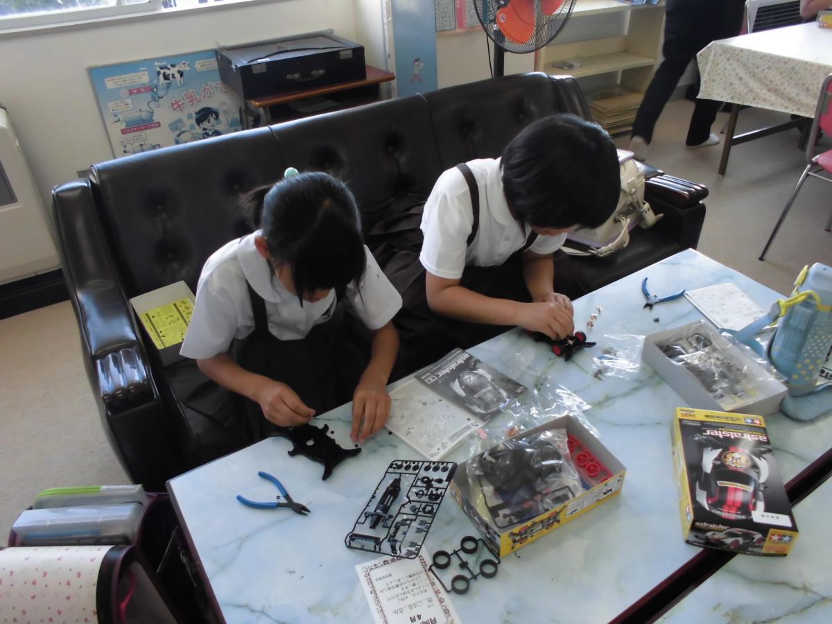 13日(木)、職員の研修を終えて図書室等をのぞくと、迎えを待つ児童は先日いただいたミニ四駆づくりに夢中です。仕上がった児童はさっそくサーキットで走らせていました。初めて作る児童も多いようでしたが、みんなミニ四駆づくりを楽しんでいました。