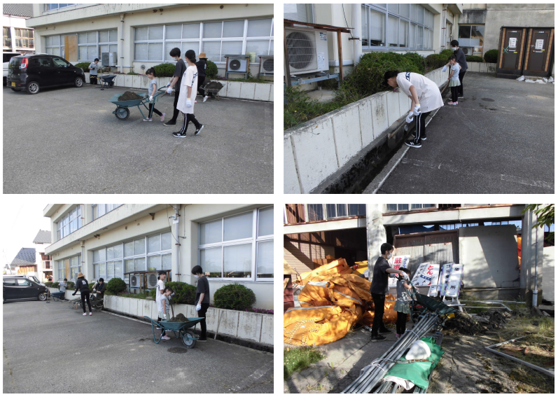 学校玄関の溝掃除を行っていただきました。1月以降のがれき等の影響で水が流れにくい状況がありましたが、約1時間の活動で、溝のがれきや落下した側溝蓋、土等が取り除かれ大変きれいになりました。