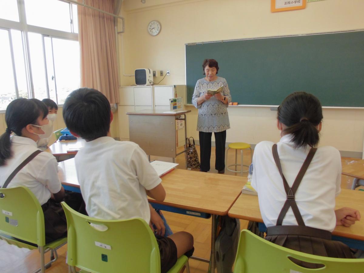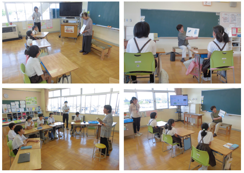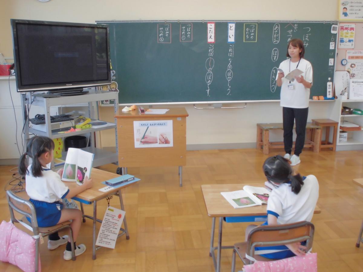 1限目の様子をのぞくと、1年生は国語、説明文の学習です。「つぼみ」を題材に、せつめいのしかたを学んでいました。2年生は国語、読み物教材「スイミー」を先生と交互に1文読みをしていました。4年生は国語、「一つの花」の学習です。戦争について扱ったお話ですが、先生から「おとなになれなかった弟たちに」という本を紹介され、その内容について聞き入る姿が見られました。6年生も国語、「文の組み立て」の学習です。短歌・五七五七七の形の中に、自分の楽しみについて、短く表現する学習のスタートの場面でした。どの学年もみんな学習に集中している様子が見られました。