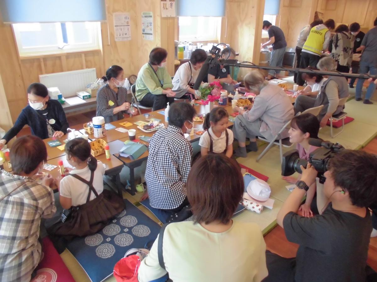 仮設住宅集会所では、毎週火~木の10時から12時に、仮設住宅の皆さんが集まって、楽しい活動に取り組まれています。この日はポチ袋づくりに取り組まれていました。子ども達は地域の皆さんと一緒にポチ袋づくりに挑戦。ものをつくる楽しさを感じながら素敵な時間を過ごすことができていました。