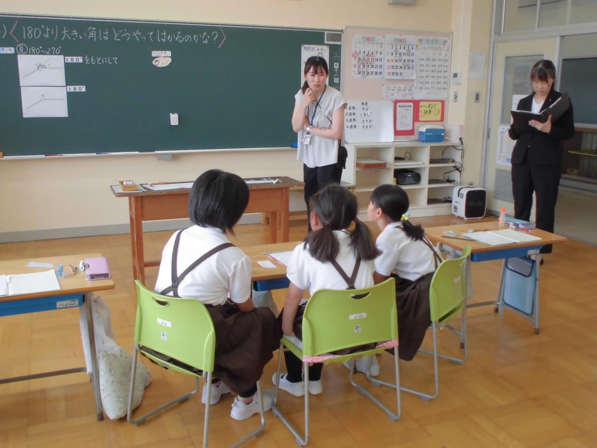 今日の授業の単元は「角の大きさ」、180°より大きい角の大きさをどのように測るかを考えます。どのような角をもとにするか、どのように補助線をひくか、角の大きさを求める式はどんな式かを、3人で話し合いながらよりよい考えや説明について話し合う姿がとてもよかったです。4年生3名の皆さん、最後までよく学びましたね。