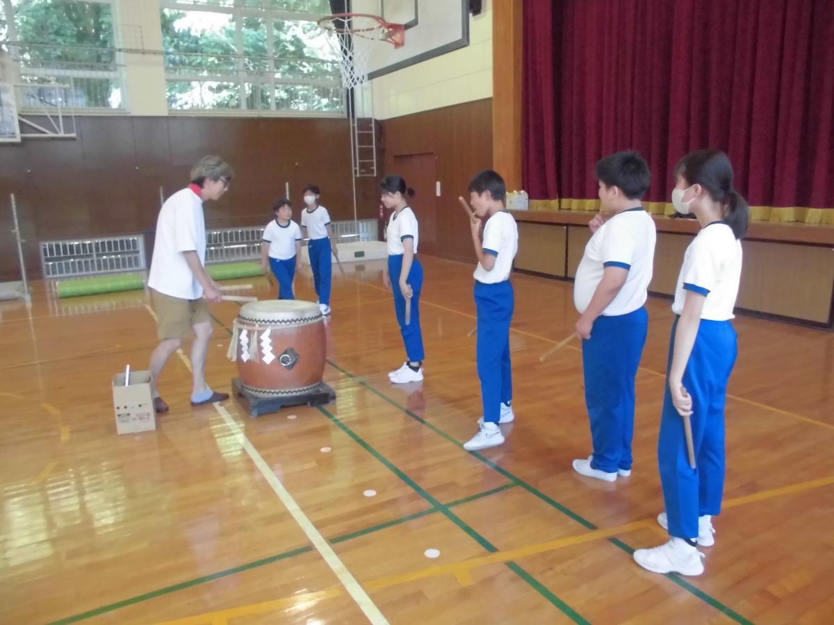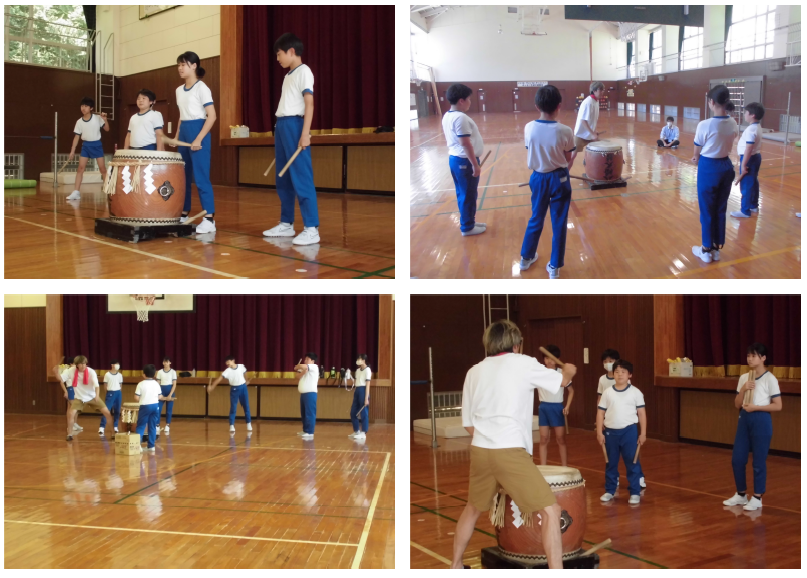 19日(水)の6限目は、今年2回目の伝承芸能クラブです。今日も瓶子さん、高山さん2名の方にご来校いただきました。体育館では八幡太鼓の練習です。6年生4名が大ばい・小ばいに分かれて練習です。3年間の練習で気づき上げてきた子ども達の技はすっかり上達しています。瓶子さんはよりよい演技ができるように、細かな部分までご指導下さいました。