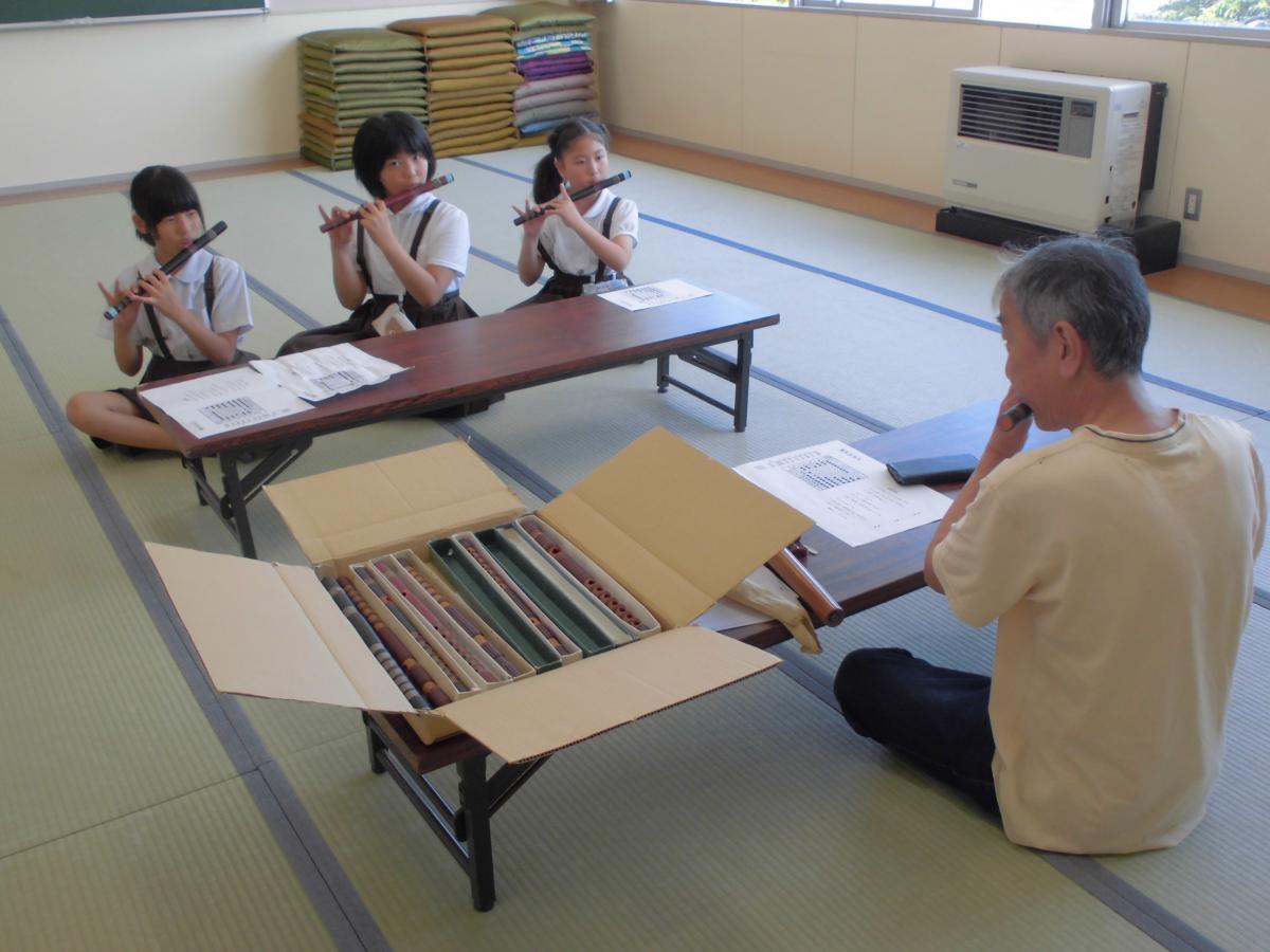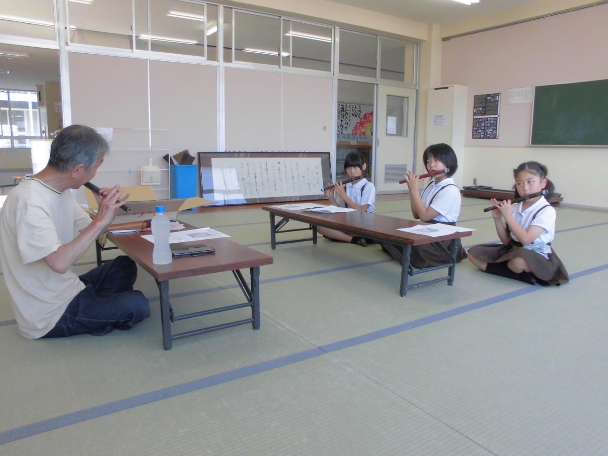 和室では、龍笛の練習です。4年生3名は、今年から練習に取り組んだばかりですが、少しずつ音が出始めていました。まだまだ思い通りの音が出ず、悔しそうな様子も見られましたが確実に上達しています!