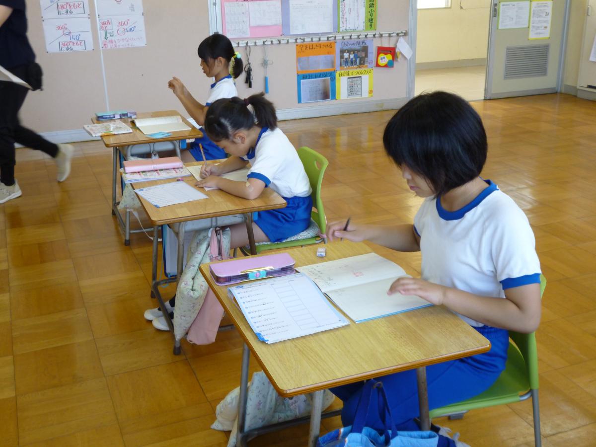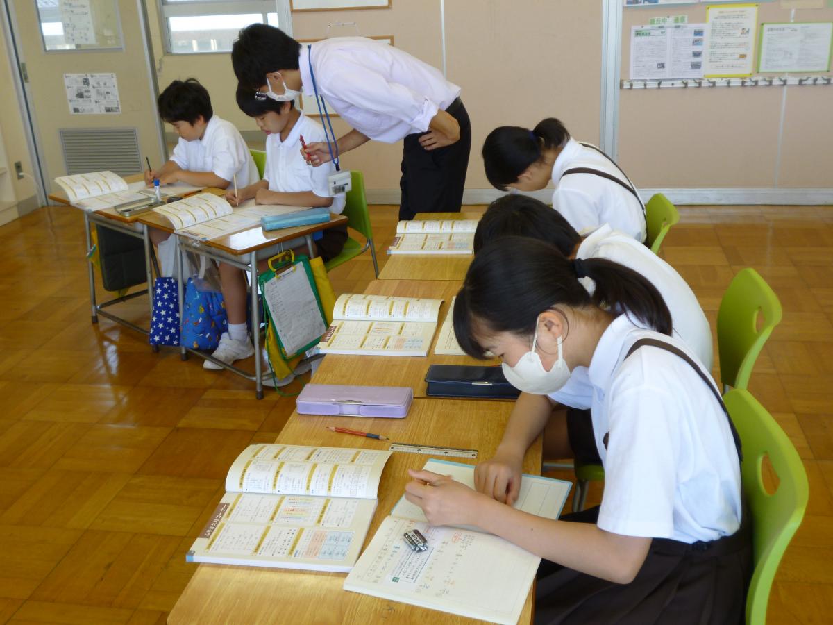 1限目をのぞくと、4年生は漢字テストの日。黙々とテスト前の学習に取り組んでいました。1年生はのばすおとの学習です。ほおずき?ほうずき?自分も悩みながら学習の様子をみていました。6年生は比の学習です。2:3と等しい比はどれ?4:6?6:9?みんなで集中して考える姿が見られました。