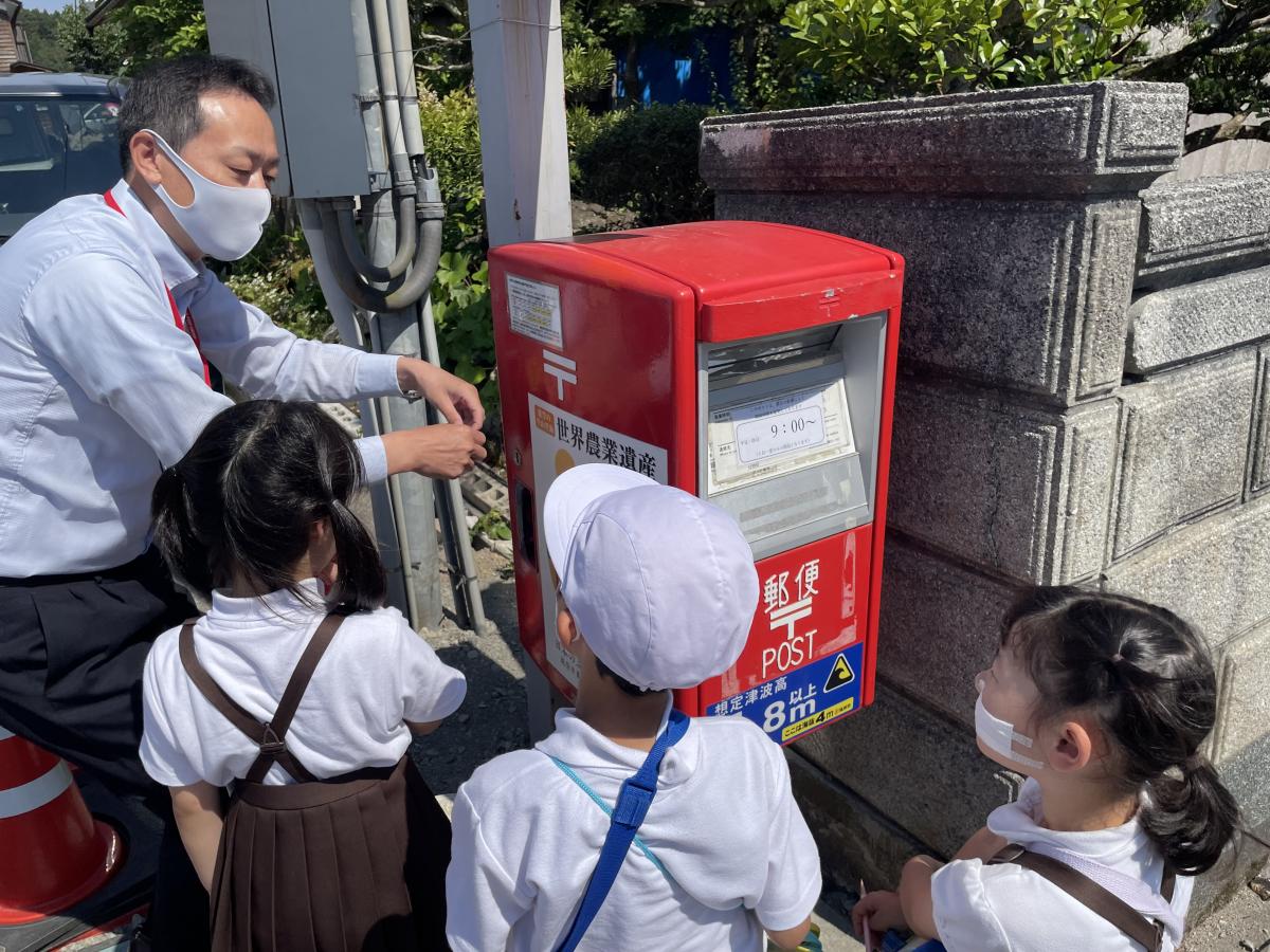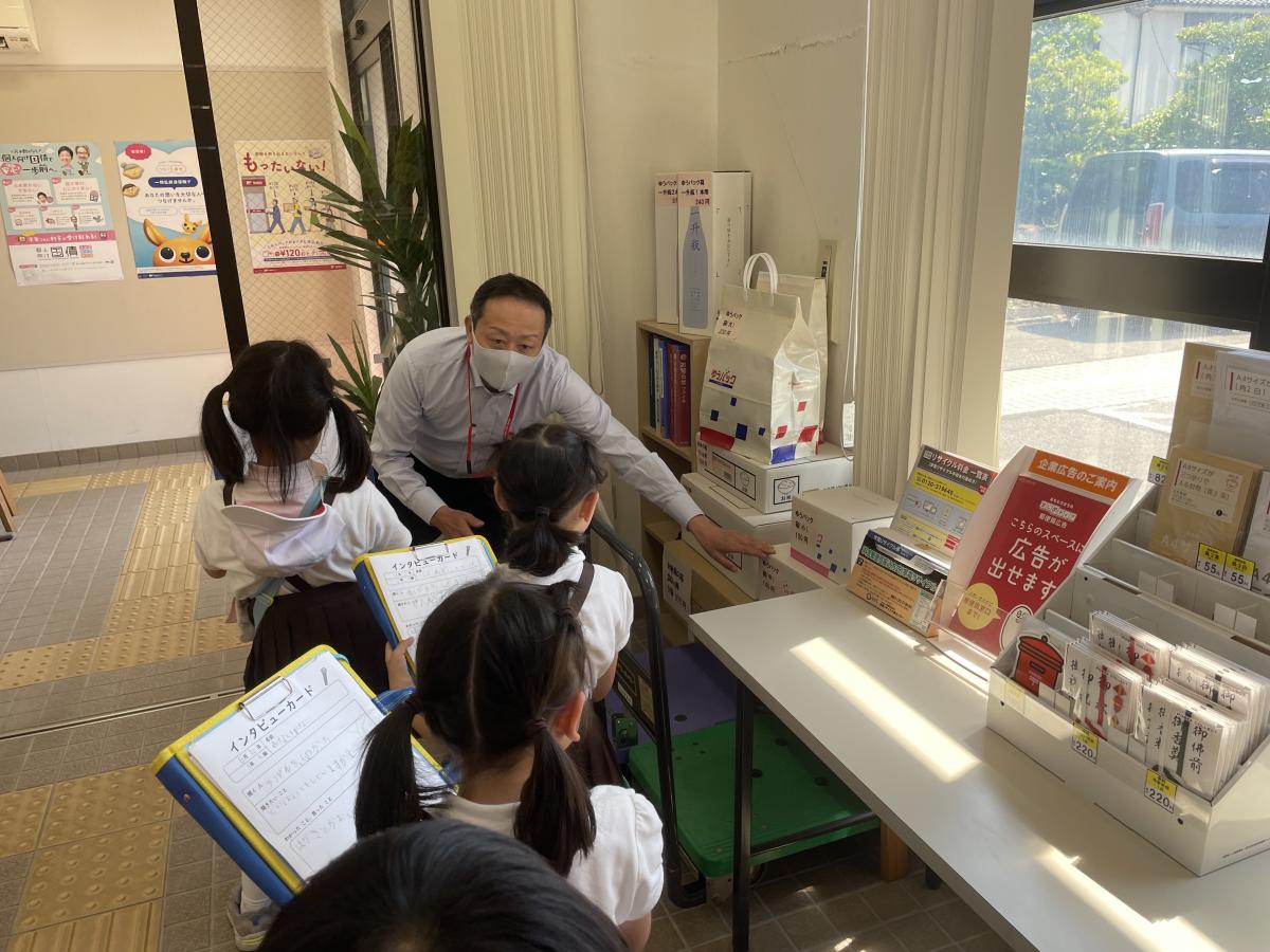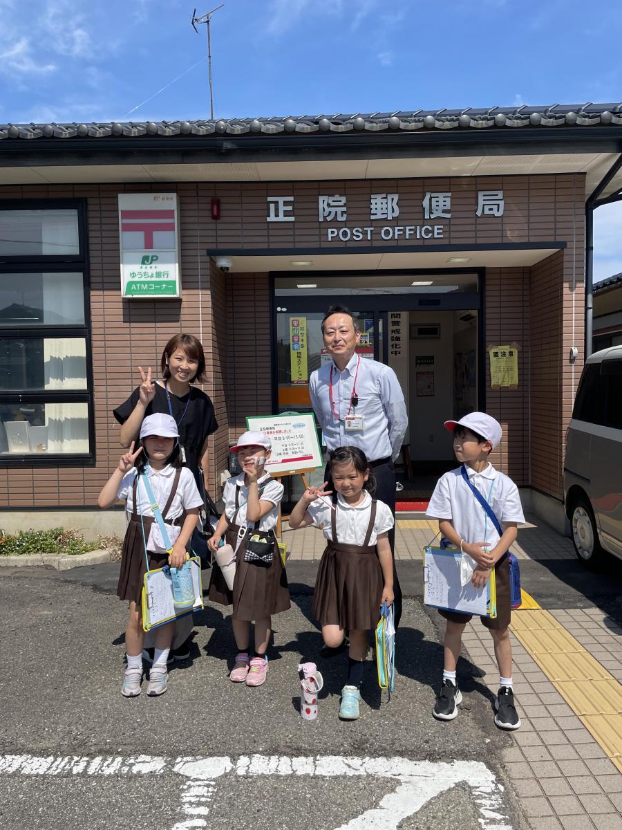 21日(金)の5限目、1・2年生は町探検で、正院郵便局さんにお世話になりました。最初に、局長さんに郵便局のお仕事のことや、郵便局を開いている時刻などを質問し、教えていただきました。その後、郵便局の中の様子を見学しました。いろいろな新しい発見があったようです。最後に自分たちが書いた手紙をポストに投函しました。1年生はお母さん宛、2年生は昨年お世話になった担任の先生や教頭先生へのお手紙でした。返事が来ることを楽しみにしている1・2年生でした。
