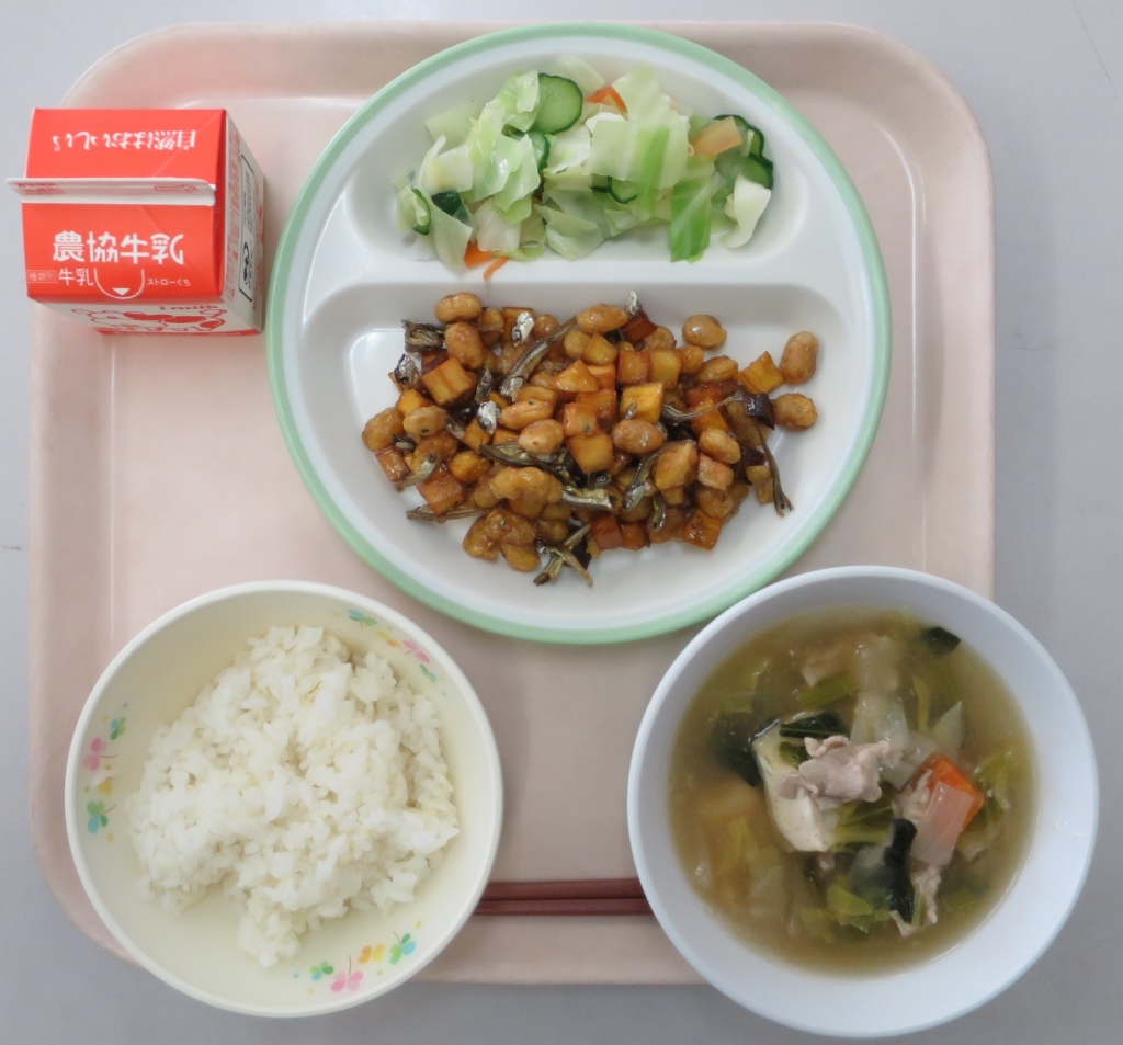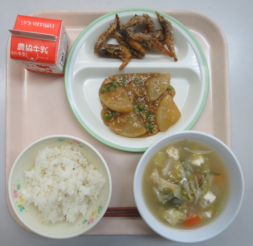 大根のそぼろ煮、みそけんちん汁、牛乳~