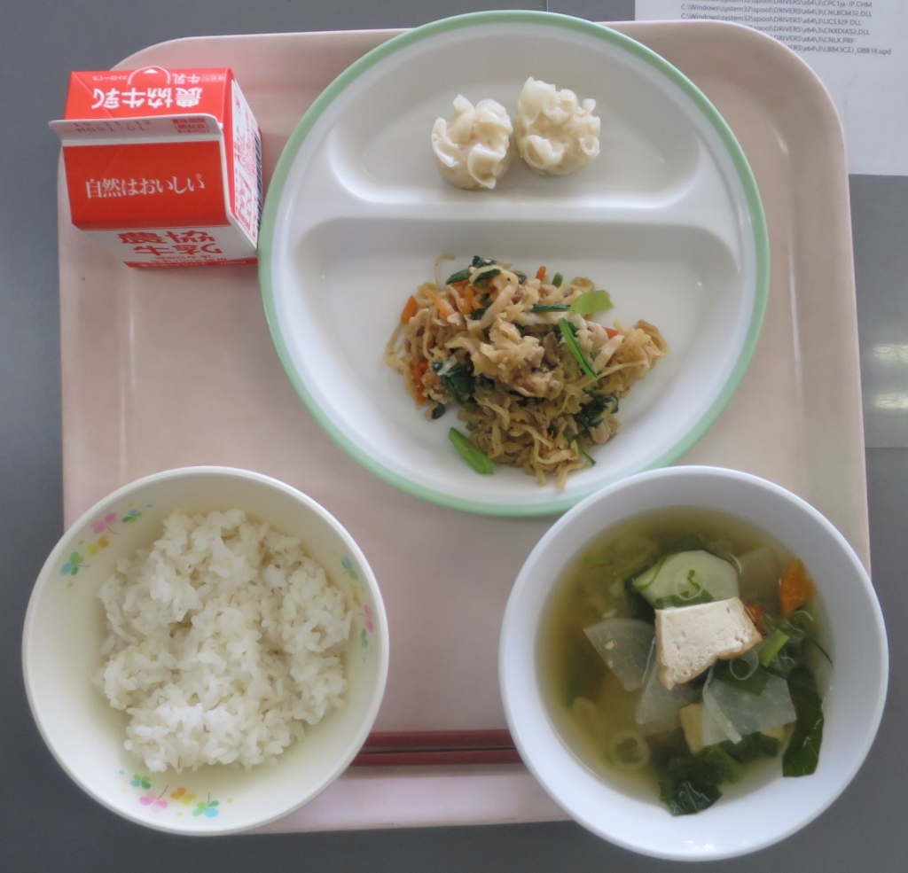 ~麦ごはん、切干大根のピリ辛炒め、蒸しエビシュウマイ、