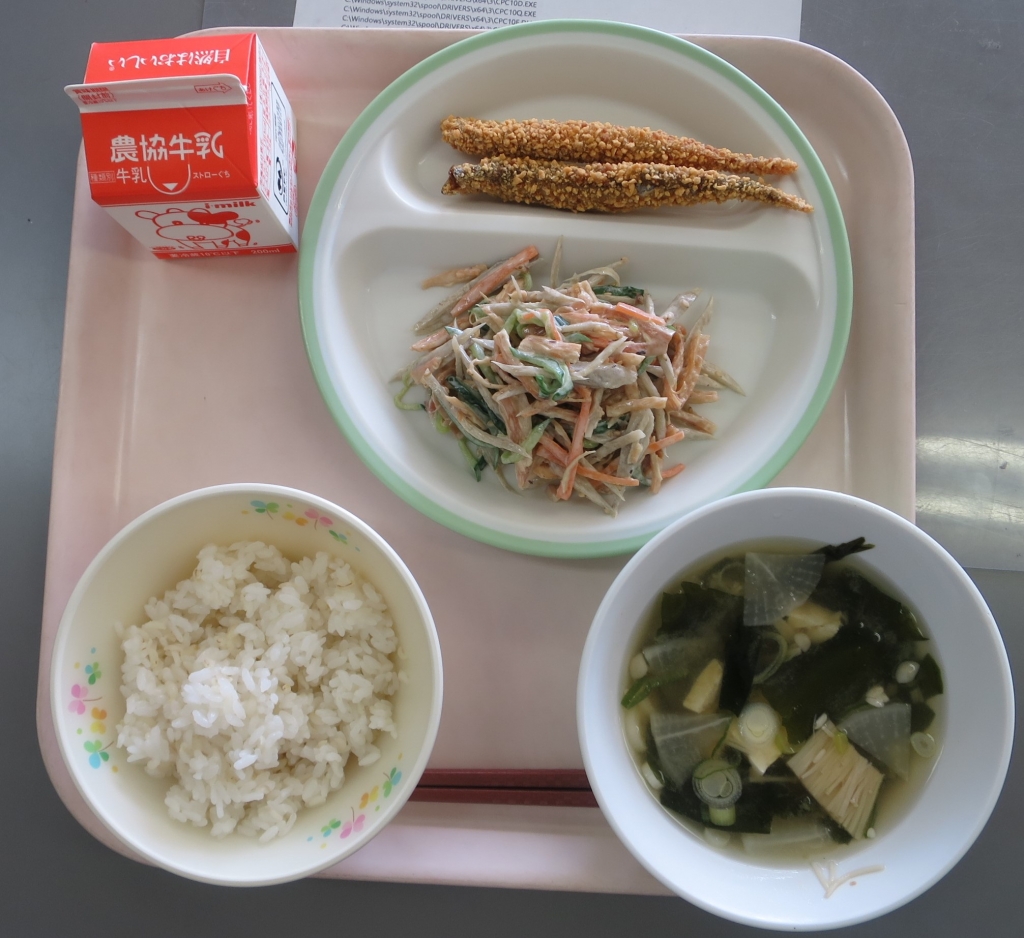 ~麦ごはん、子持ちシシャモフライ、かむかむサラダ、