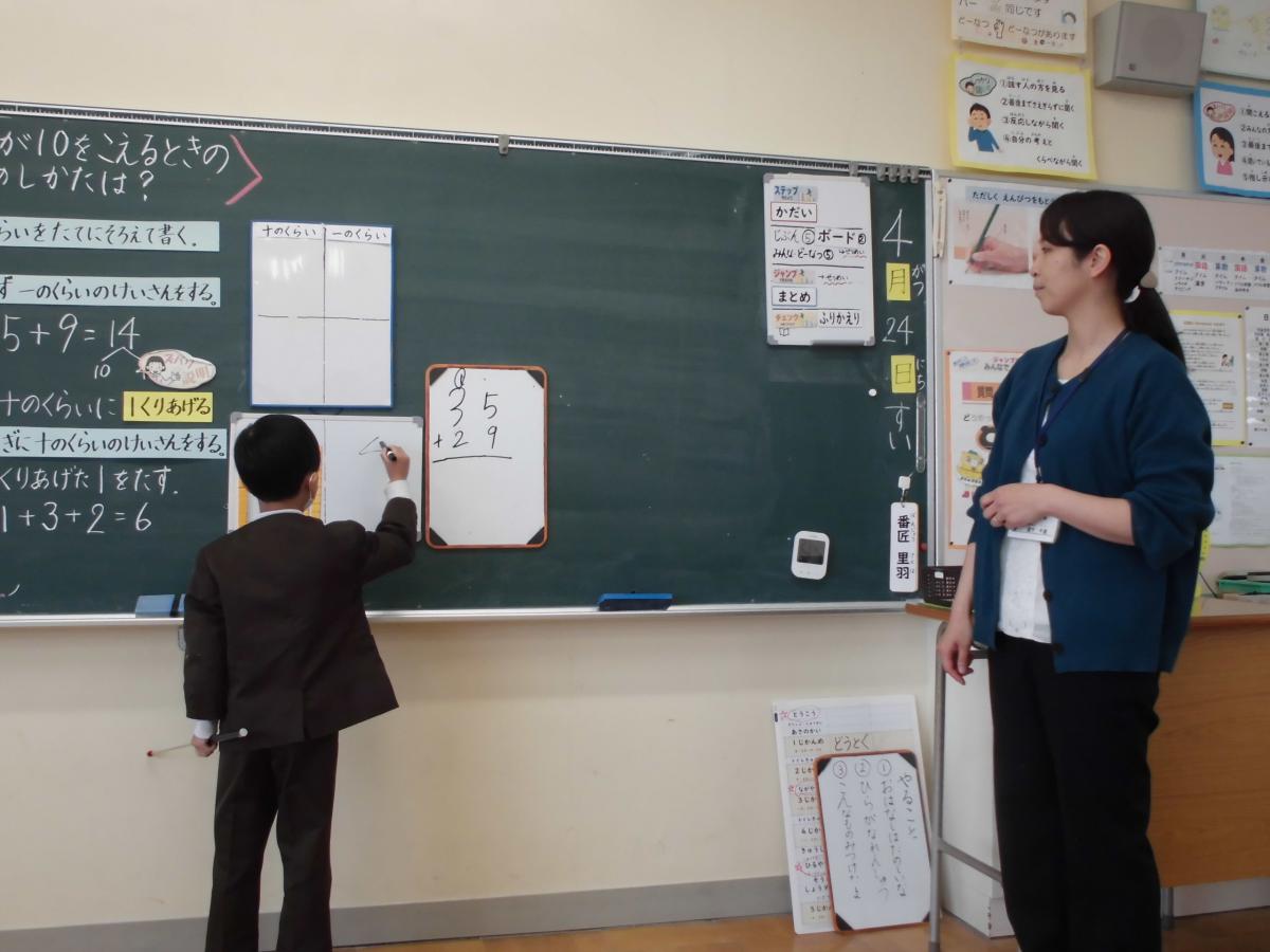 本日は、繰り上げりのある2ケタ+2ケタのひっ算の学習でした。児童は、筆算しながら、ブロック操作しながら自分の考えを繰り返し説明する姿が見られました。