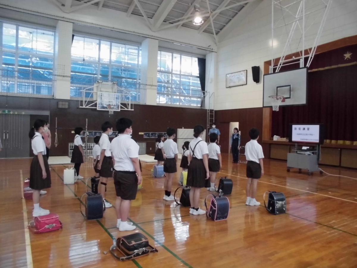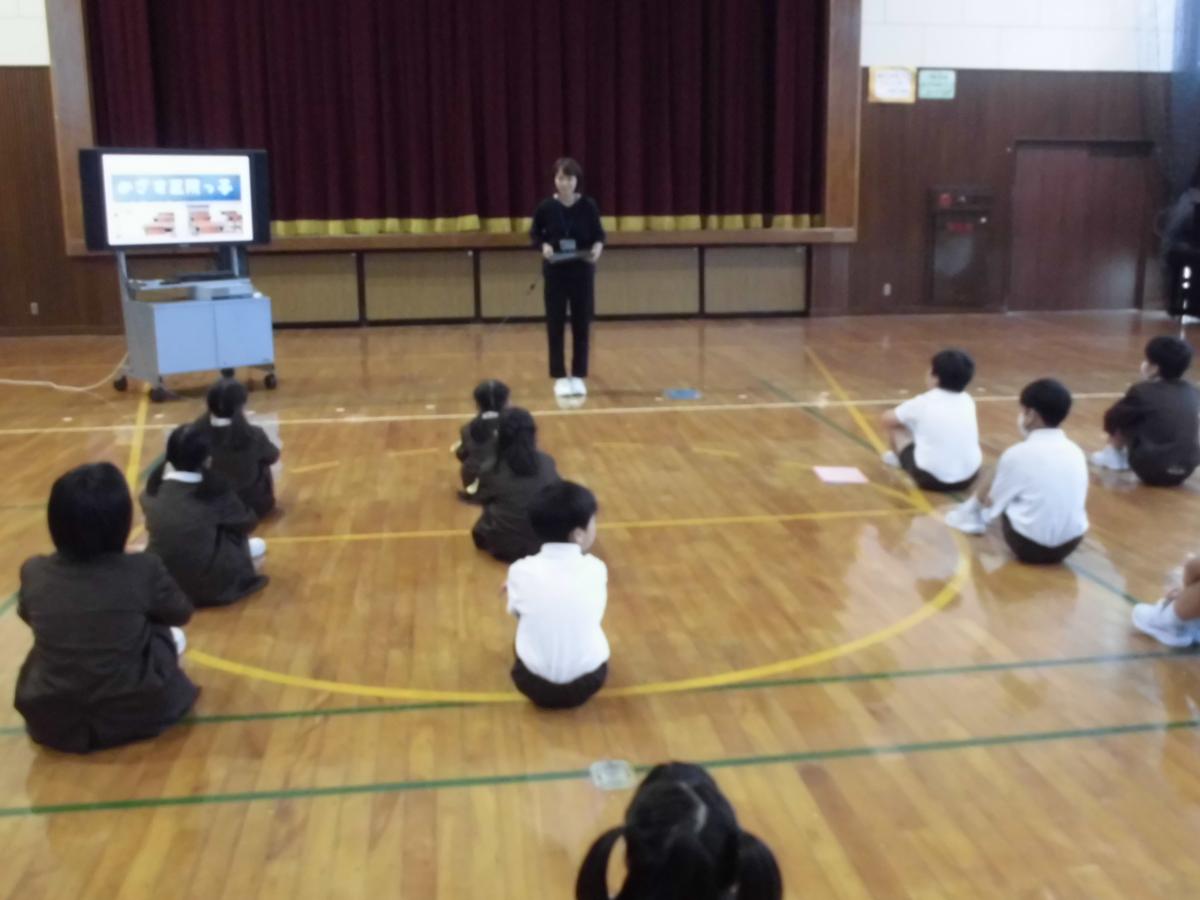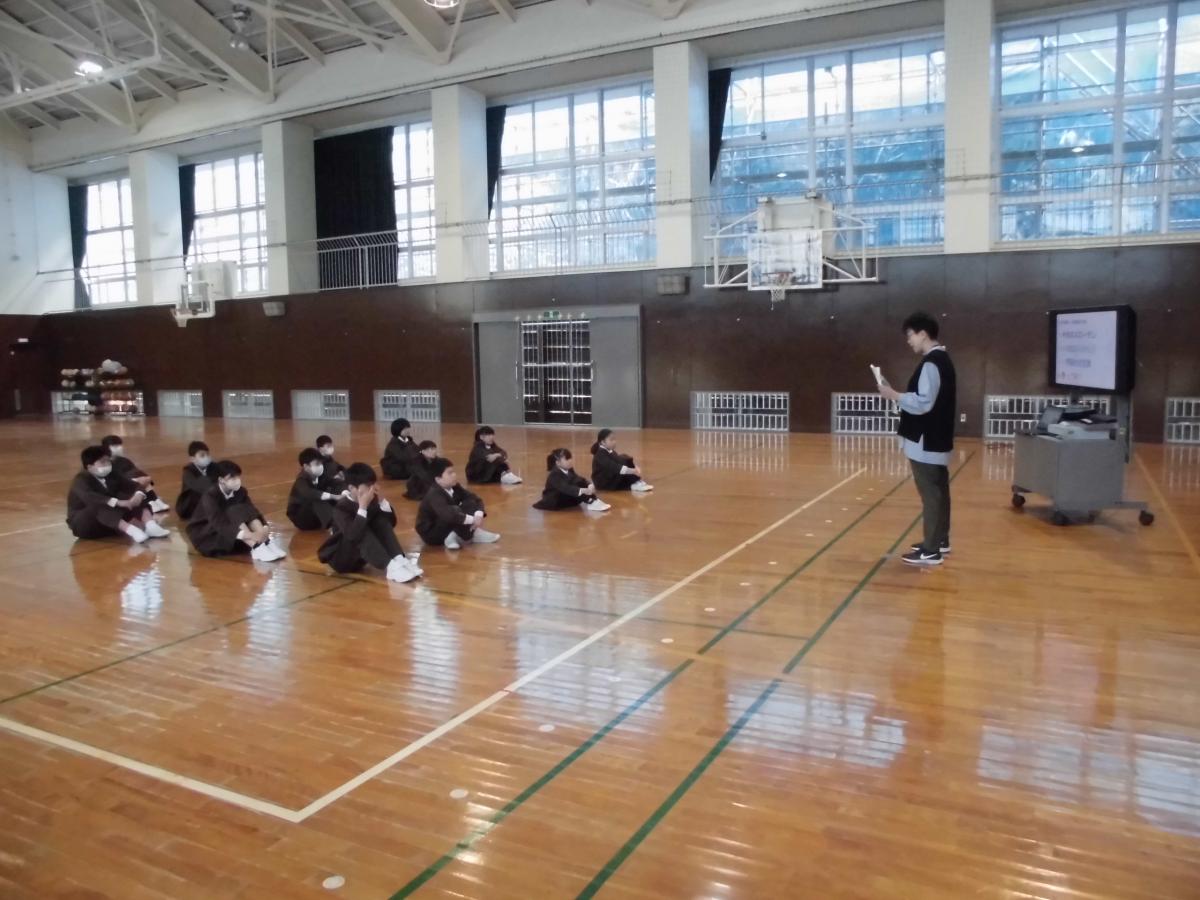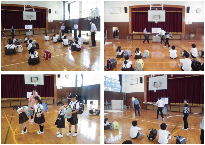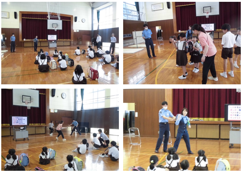 その後は、体育館で児童の学びの時間です。登下校等で不審者に出会ったときの対応の仕方をご指導いただきました。子どもたちは大きな声を出して、素早く不審者から逃げる練習ができていました。もし実際に起こった時に対応できる力をつけていけたらと感じました。