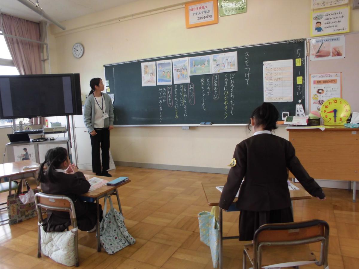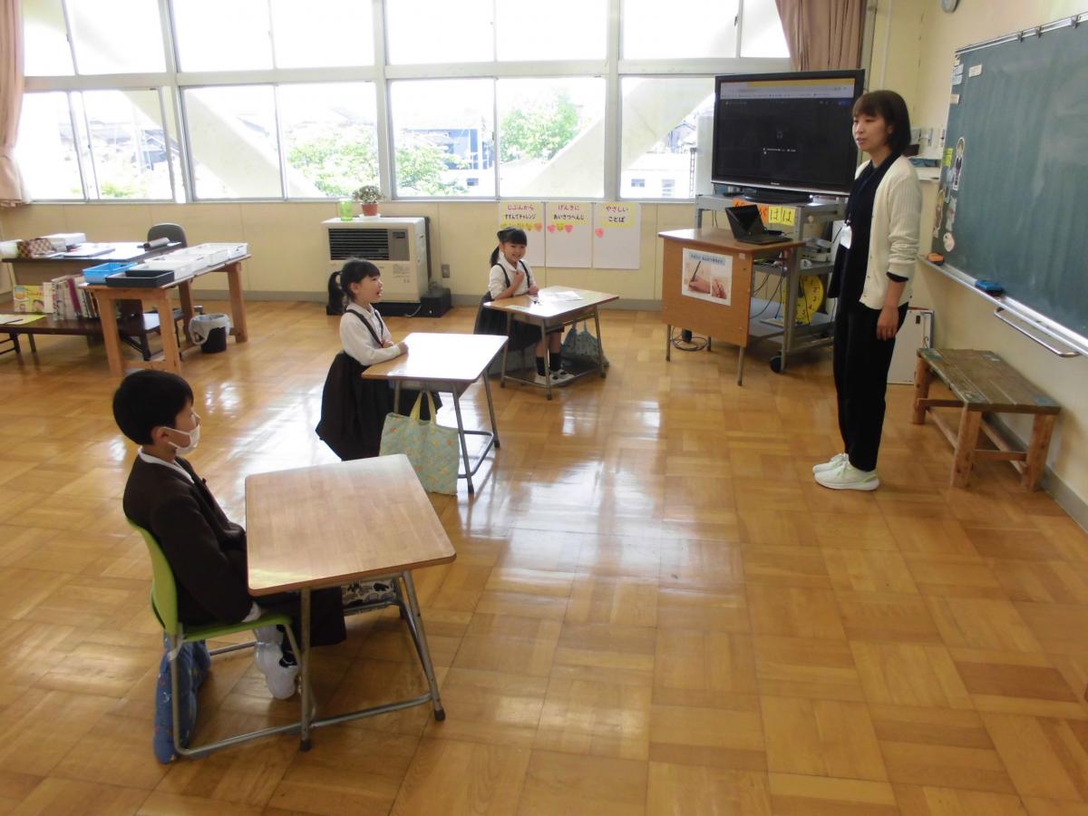 続いて、研究主任からめざす正院っ子、5月のめあての話がありました。5月は《イスにしっかりすわる子》です。足の裏ペタ・背筋ピンなど、目指す具体的な姿を子ども達と共有しました。