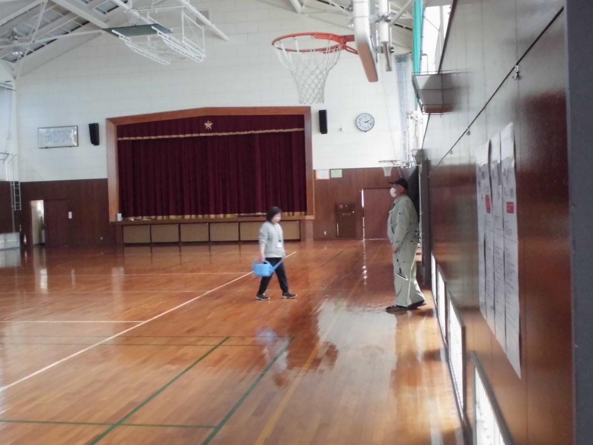 並行して、来週7日(火)から、2階校舎も使えるように校内の整理整頓もすすめています。今日は体育館ワックスがけの日。昨年12月の冬休みにワックスがけしたときと同じように、きれいな体育館に戻りました。子どもたちには、明日から元気に体育館全面を走り回ってほしいと願っています。