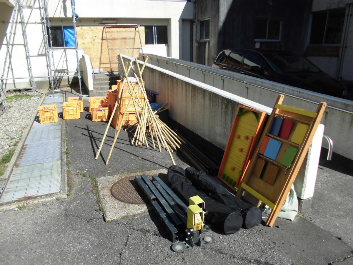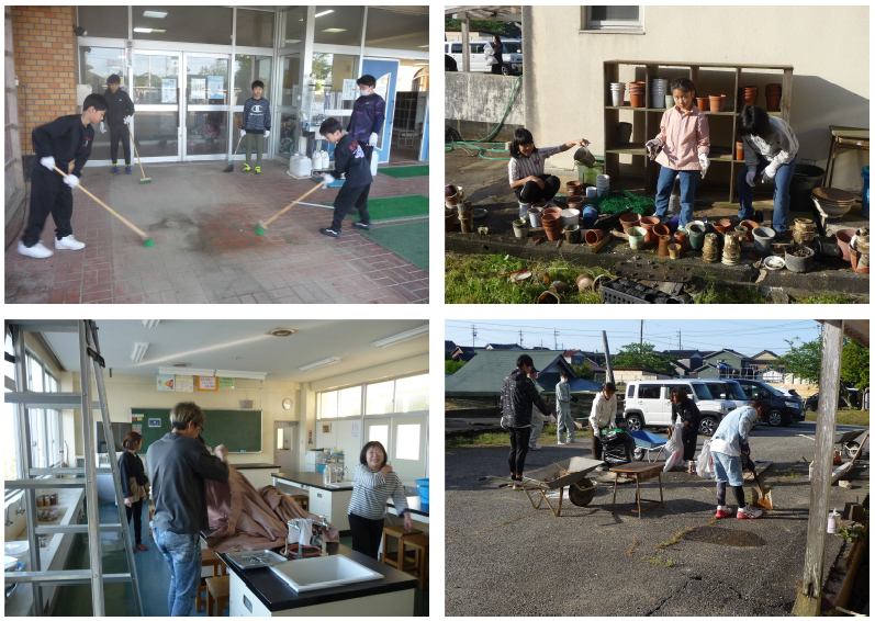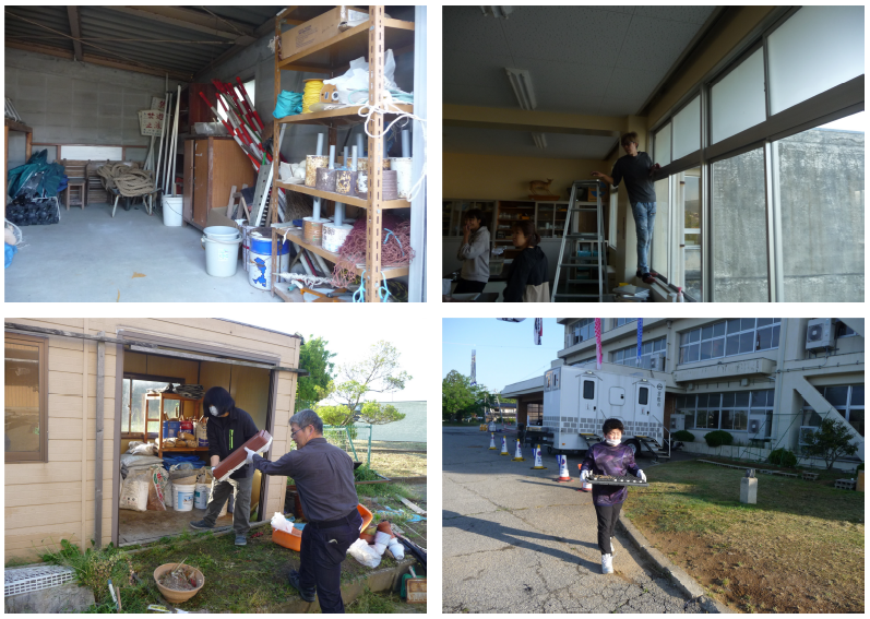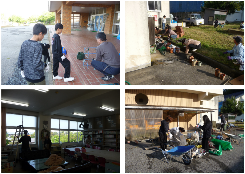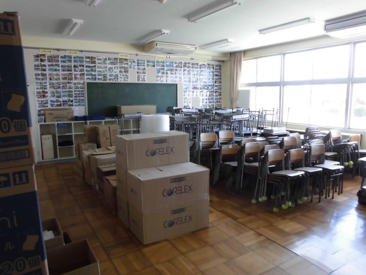 7日(火)からは、校舎2階も使用して、通常の教育活動を行う予定です。2日(木)の午前中、正院避難所の防災士さんにもお手伝いいただいて、校舎2~3階の整理をすすめました。