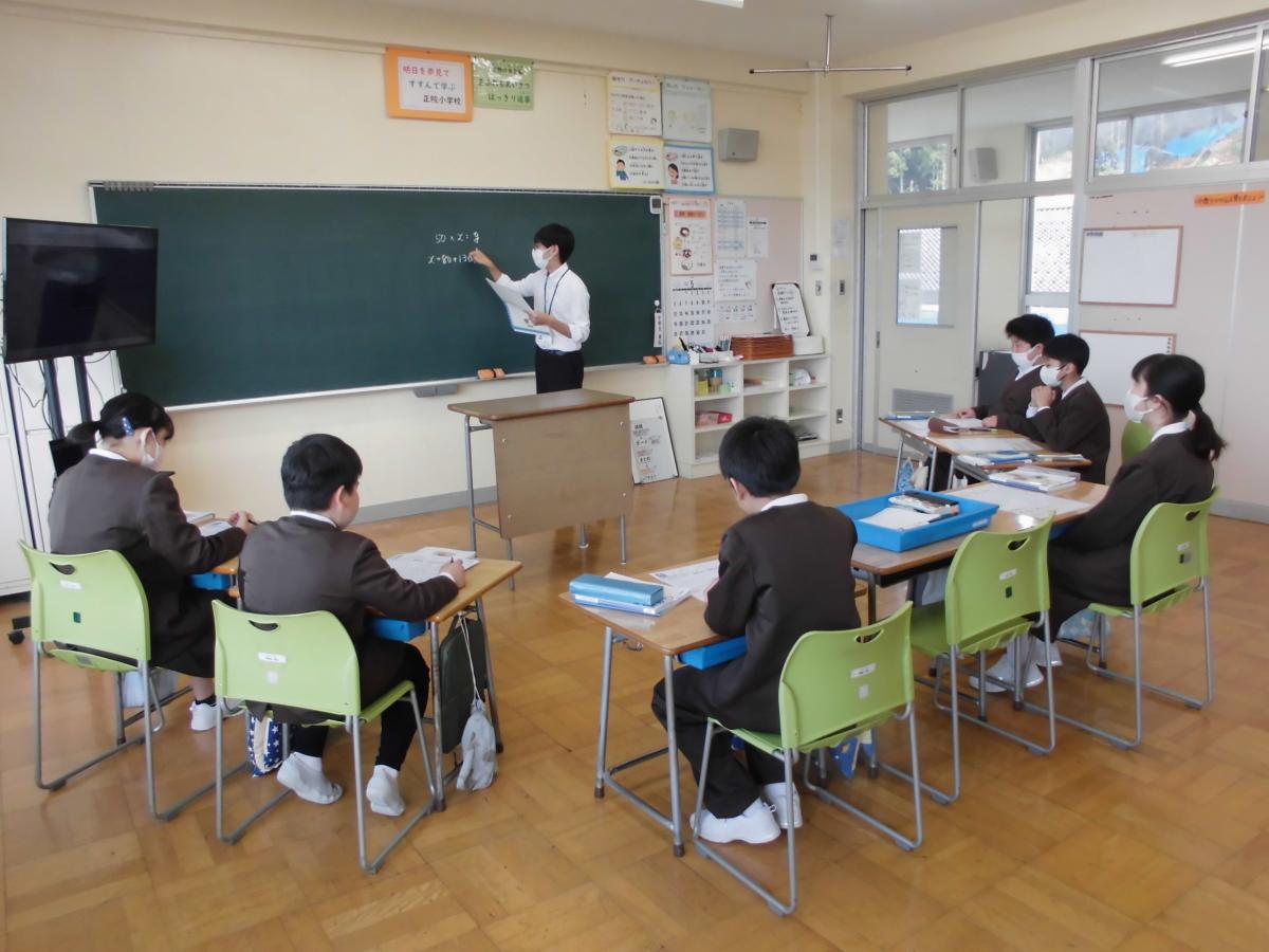 7日(火)の3限目に、6年算数の研究授業を行いました。今年度も算数科を中心に授業改善をすすめます。今日は分数のかけ算の学習でした。2/7×3の計算の仕方を説明する授業でした。1/7×(2×3)の式をかき、1/7が6こ分で6/7になることを説明します。子ども達は、。自分の考えた式を書き、すすんで説明し合う姿が見られました。今年度もよい授業から研究授業がスタートできたと感じています。