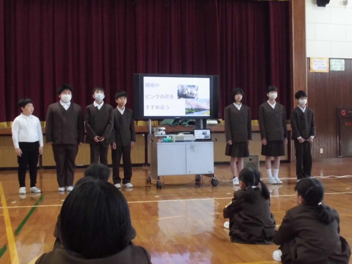 火曜日は朝の集会の日。今日は全校集会です。最初に校歌を歌いました。伴奏は6年生2名が担当してくれています。今日は今年度初めて伴奏してくれる児童でした。少し緊張のおももちでしたが、上手に最後まで伴奏してくれました。12名の歌声も、今まで通り素晴らしい!また地域の皆さんに切ってほしいと思う時間ともなりました。