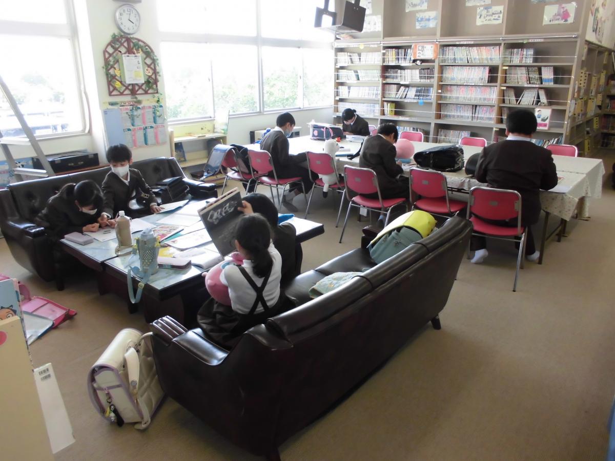 朝読書の様子を見に行くと、6年生は全員クロームブックに入力中、聞いてみると昨日のSDGs学習会の感想のようです。みんなが集中して入力する姿が素敵でした。4年生は、今日は特別に図書室で朝読書、本の貸し借りの手続きも行っていました。
