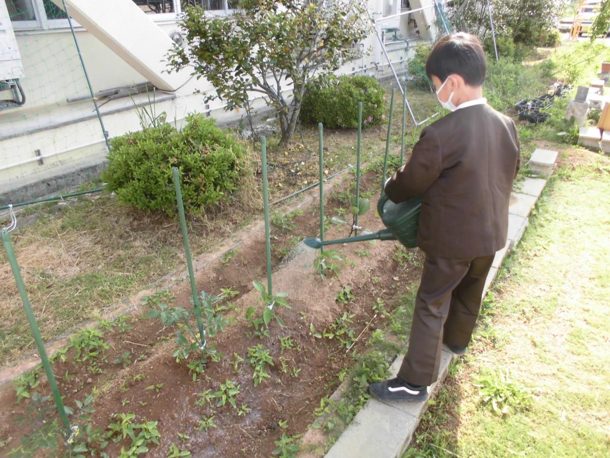 13日(木)の朝、今日も朝から快晴、昨日に続き暑くなる予報です。みんなの登校の様子を見ていると、登校すると水やり!が定番となってきました。土に指をあてて、しめり具合を確認しながら行っています。埼玉県の地球市民学習様からいただいて植えたバラに水をやってくれている児童もいます。どの植物も、子どもたちの願うようにスクスク育ちますように!