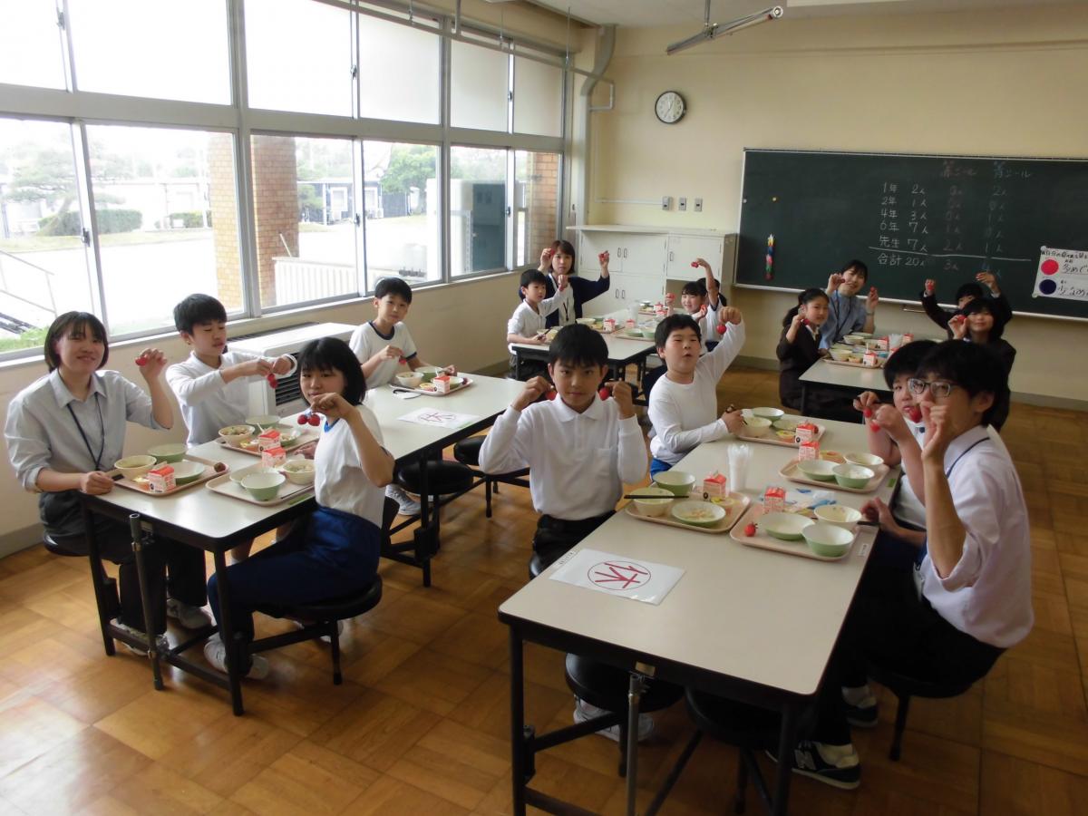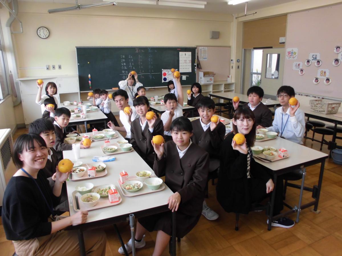 今日の給食時は、愛媛県から届いた贈り物を紹介し、一緒に届いた北山崎小学校の児童みなさんのメッセージも読み上げて紹介しました。