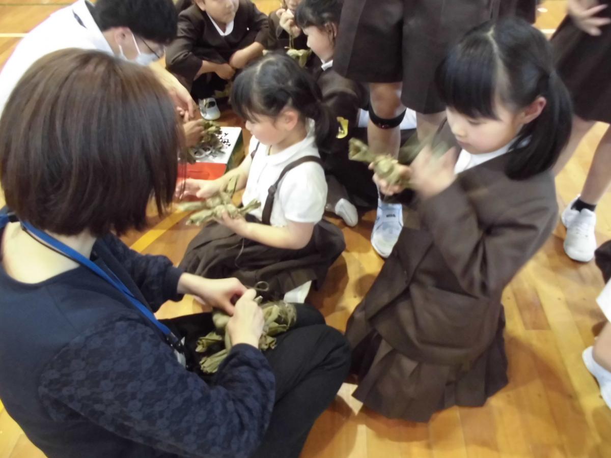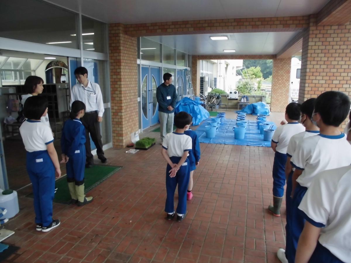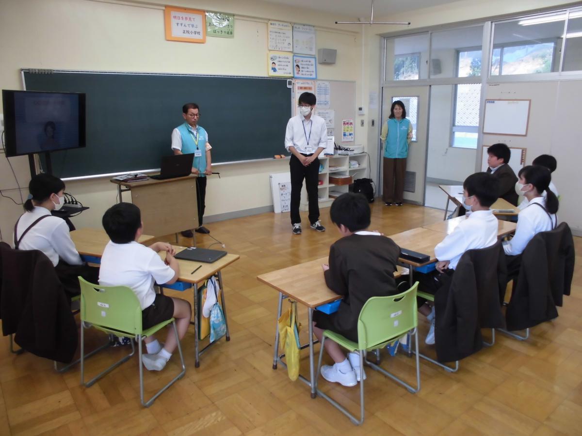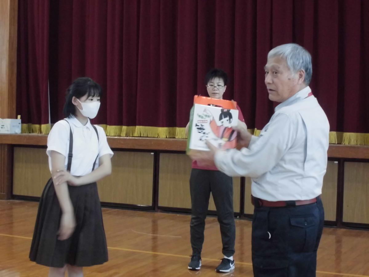 4日(火)の午後、4月に新潟県・南万代小学校とのオンライン交流でお世話になった新潟県・防災士会の皆様が来校され、子ども達に笹団子をプレゼントしてくれました。子ども達は久しぶりの再会を喜ぶと共に、おいしそうな笹団子をいただいて嬉しそうでした。新潟県防災士会の皆様は、これから数日ボランティア活動に取り組まれるとのこと。大変ありがたい限りです。